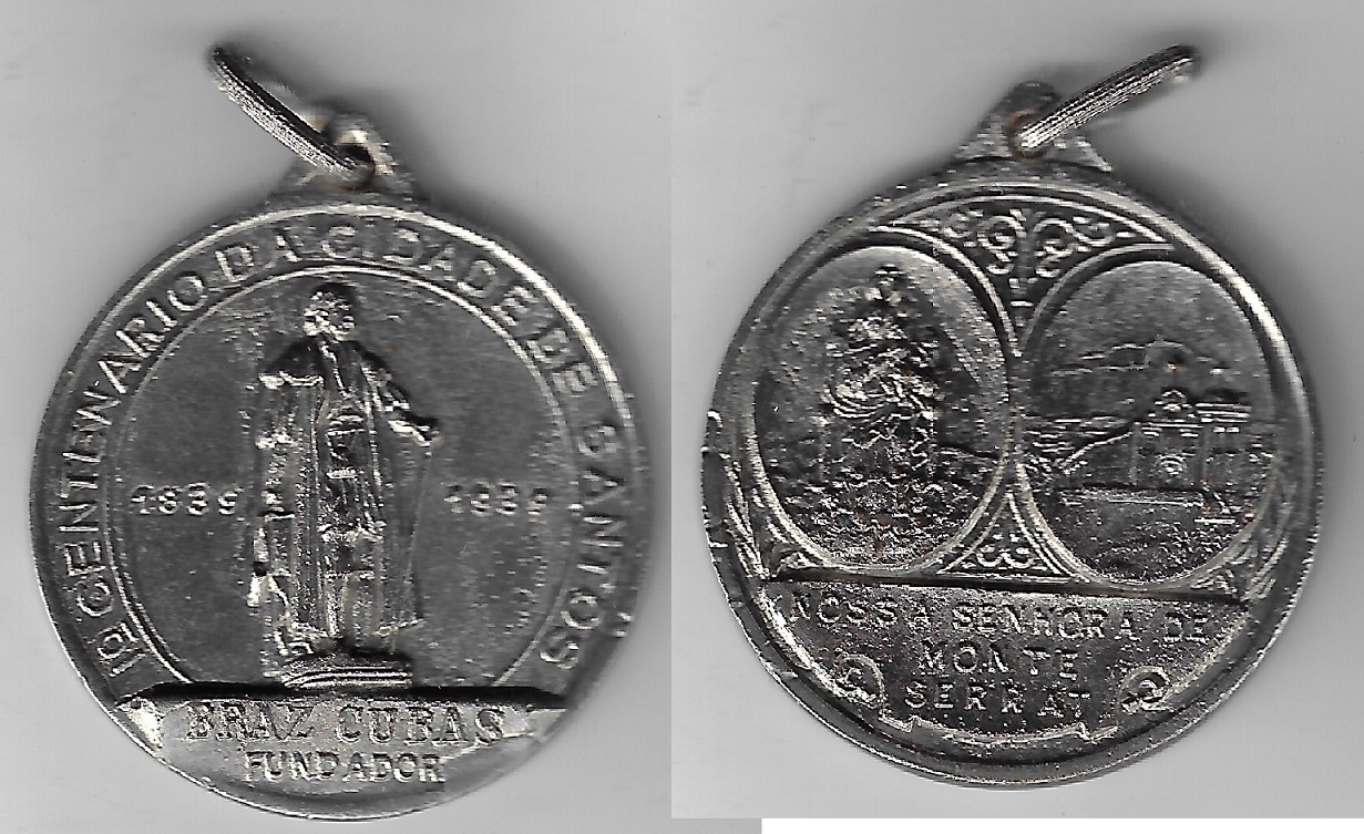 | 79839 | Medalha, 1939, alusiva ao 1º Centenário da Cidade de Santos, figurando monumento a Brás Cubas e Igreja Nossa Senhora do Monte Serrat, Prateada, Ø 30 mm, com olhal, 11 gramas, Soberba | 92,00 | Foto |