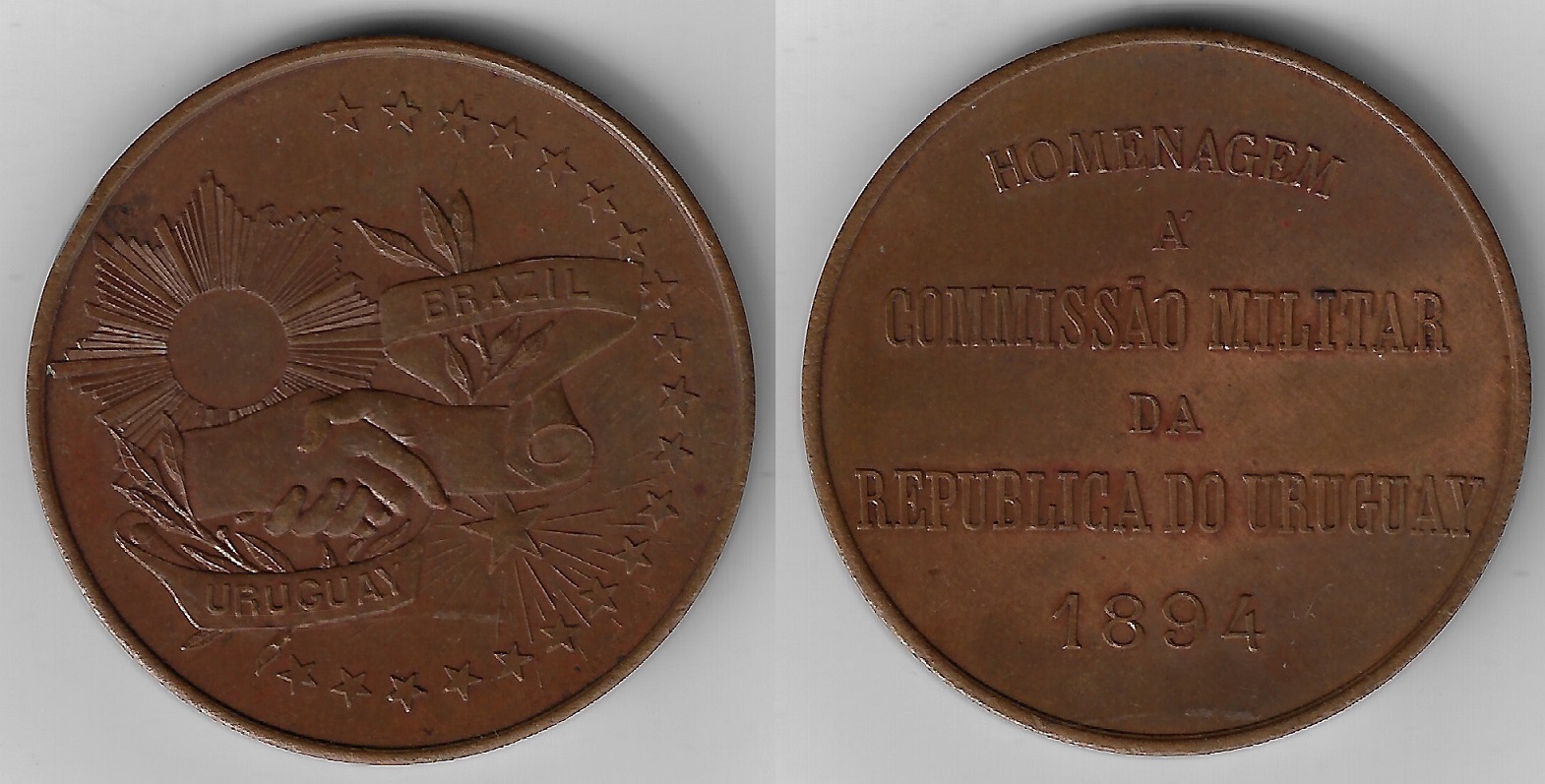 | 80313 | Medalha, 1894, alusiva a Homenagem à Comissão Militar do Uruguai, 25 gramas de Cobre, Ø 39 mm, gravador Carneiro | 390,00 | Foto |