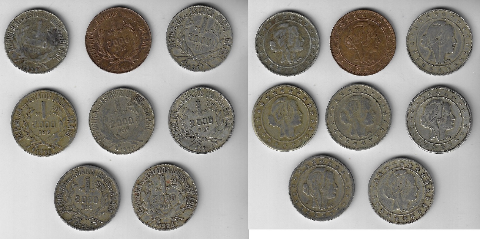 | 82231 | 2.000 Réis, 1924/1926, 8 moedas Falsas de Época, os pesos são 6,5, 6,6, 6,7, 6,8, 7,2, 7,5, 8,2, 8,7 gramas, MBC | 127,00 | Foto |