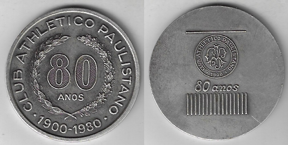 | 83548 | Medalha, 1980, 80 Anos do Club Athletico Paulistano, Bronze Prateado, Ø 40 mm | 60,00 | Foto |