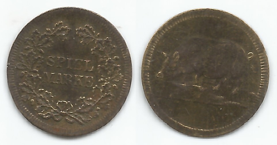 | 63391 | Alemanha, Ficha Token Spiel Marke figurando porco, Ø 18 mm, marca de leve dobra | 20,00 | Foto |