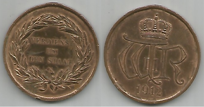| 70060 | Alemanha / Prússia, 1912, medalha "Verdienst um den Staat" (Mérito pelo Estado) e iniciais do Rei Wilhelm II, Bronze, Ø 39,5 mm, 19,7 gramas, olhal quebrado | 150,00 | Foto |