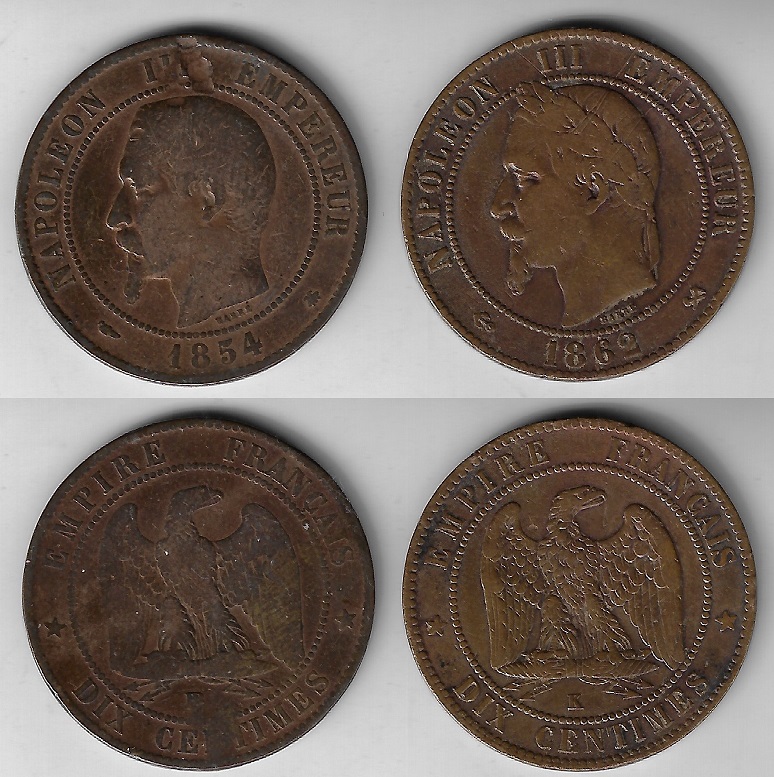 | 70400 | França, 10 Cêntimes, 1854B e 1862K, Bronze, KM-771-2 e KM-798.3, Napoleão III, MBC/BC com furo tapado e MBC | 52,00 | Foto |