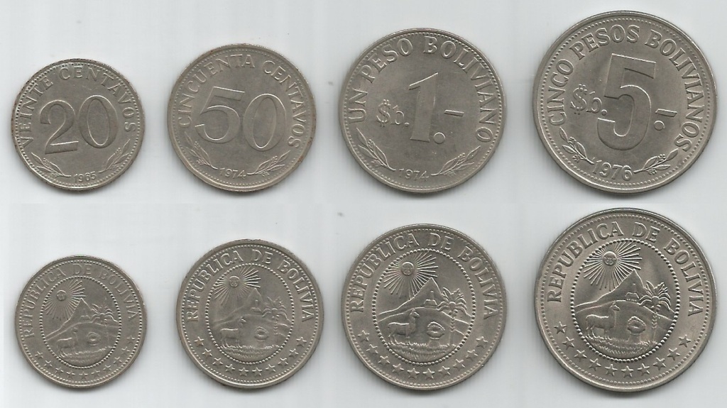 | 70406 | Bolívia, 20 (1965) e 50 (1974) Centavos, 1 (1974) e 5 (1976) Pesos Bolivianos, Níquel, KM-189, 190, 192 e 197, FC | 41,00 | Foto |