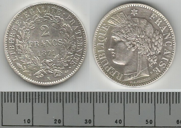 | 70528 | França, 2 Francos, 1871K, 10 gramas de Prata .835, KM-817.2, S+ | 1200,00 | Foto |