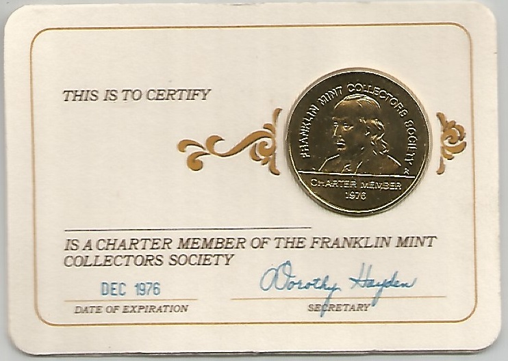 | 70679 | EUA, 1976, medalha de membro da The Franklin Mint Collectors Society, folheada a ouro, Ø 27 mm, FC no estojo | 30,00 | Foto |