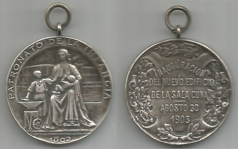 | 70682 | Argentina, 1903, medalha alusiva a Inauguração de Novo Edifício de La Sala Cuna, metal ?, Ø 31 mm, com olhal, MBC | 50,00 | Foto |