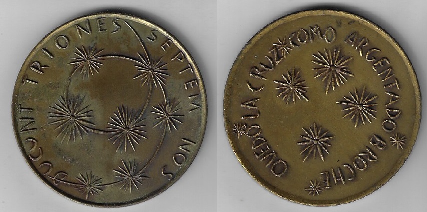 | 70683 | Argentina, 19??, medalha alusiva ao Cruzeiro do Sul ("Quedó la cruz como argentado broche" = "Ficou a cruz como um prateado broche"), metal ?, Ø 51 mm, MBC | 50,00 | Foto |