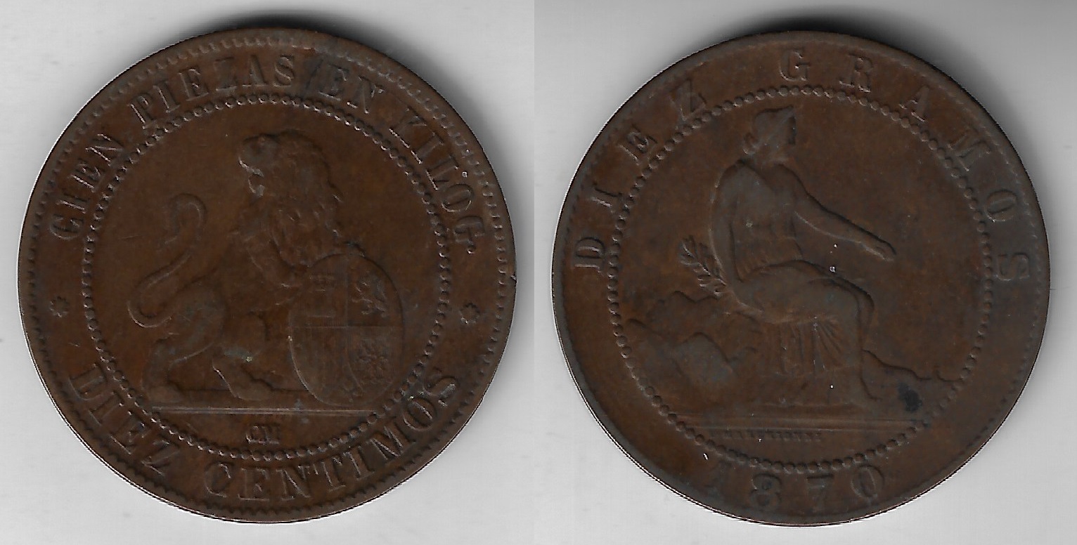| 73192 | Espanha, 10 Cêntimos, 1870 OM, Cobre, KM-663, MBC | 80,00 | Foto |
