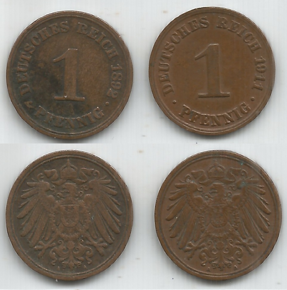 | 77401 | Alemanha, 1 Pfennig, 1892A e 1911A, Cobre, KM-10, MBC | 24,00 | Foto |