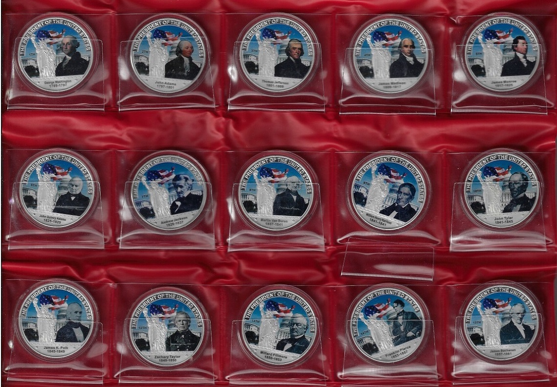 | 77923 | EUA, conjunto com 45 medalhas, sendo 44 delas retratando todos os presidentes, 22 gramas de metal prateado esmaltado, Ø 40 mm, todas acondicionadas em acrílico, acompanham 3 pastas dobráveis vermelhas, FC | 720,00 | Foto |