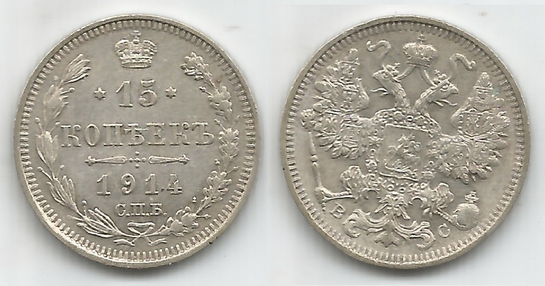 | 78072 | Rússia, 15 Kopeks, 1914, 2,7 gramas de Prata .500, KM-21a.2, Ø 20 mm, FC | 166,00 | Foto |