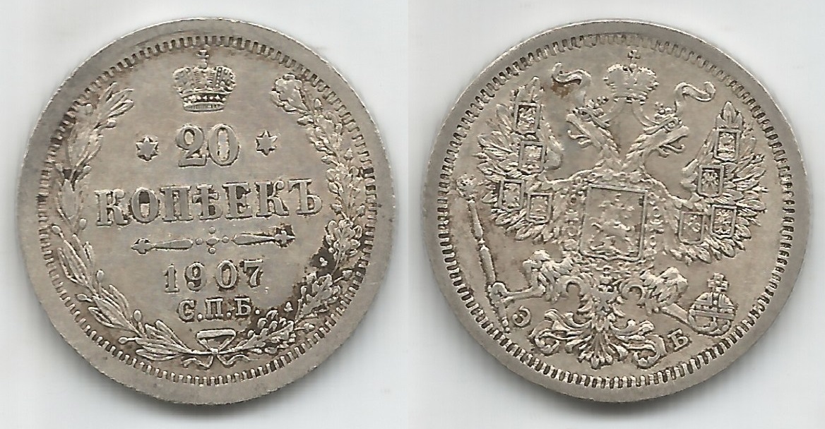 | 78073 | Rússia, 20 Kopeks, 1907, 3,6 gramas de Prata .500, KM-22a.1, Ø 22 mm, FC | 139,00 | Foto |