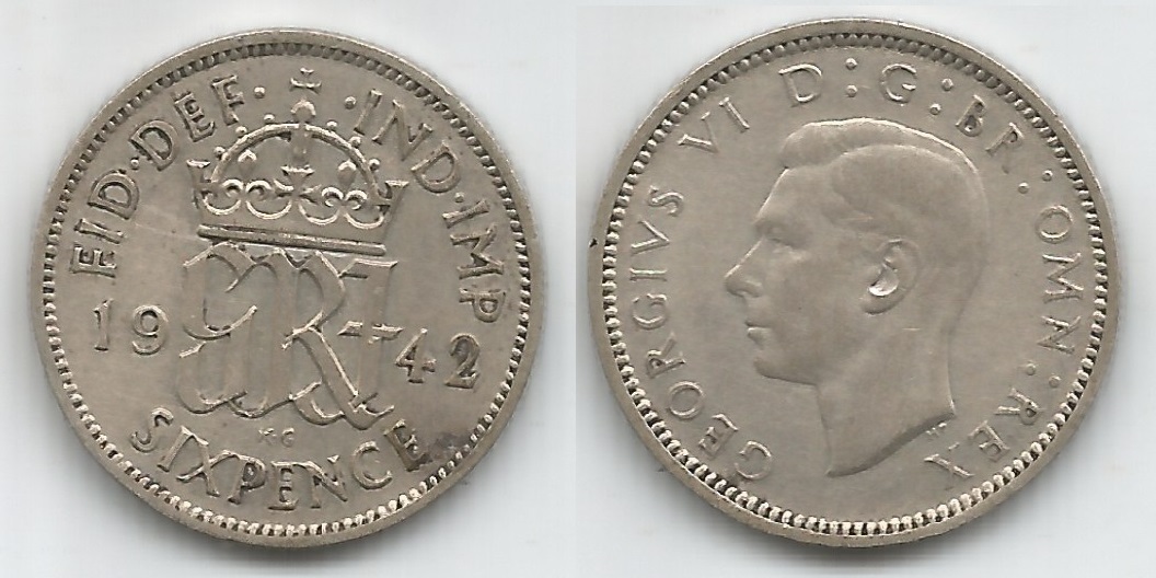 | 78128 | Grã-Bretanha, 6 Pence, 1942, 2,83 gramas de Prata .500, KM-852, Ø 19 mm, Rei George VI, FC | 50,00 | Foto |