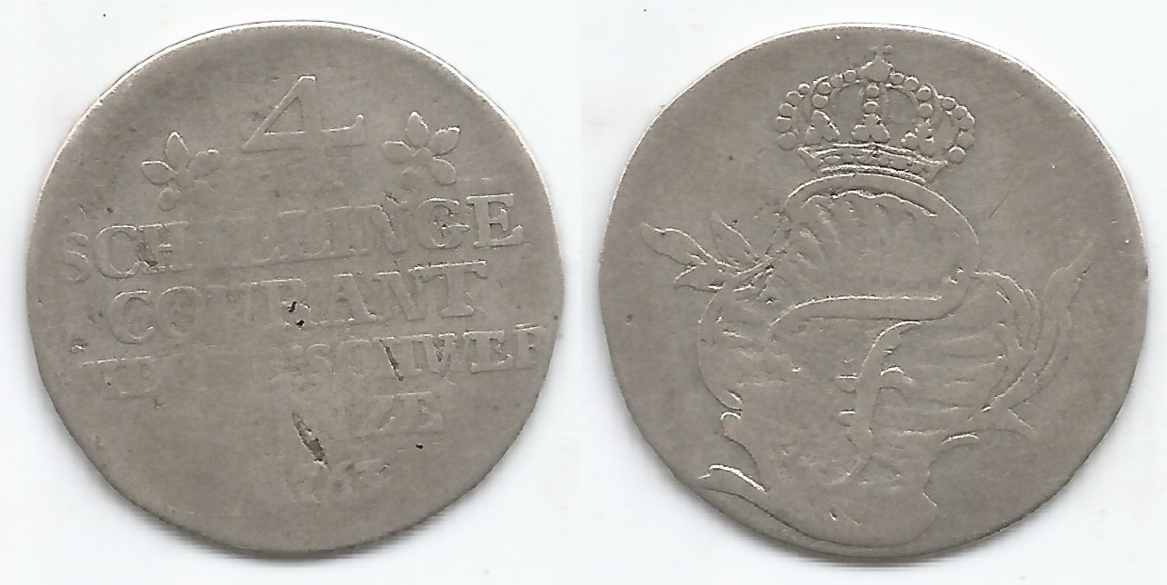 | 78144 | Alemanha / Mecklemburg-Schwerin, 4 Schilling, 1763, 3,06 gramas de Prata .562, KM-206, Ø 25 mm, BC | 128,00 | Foto |