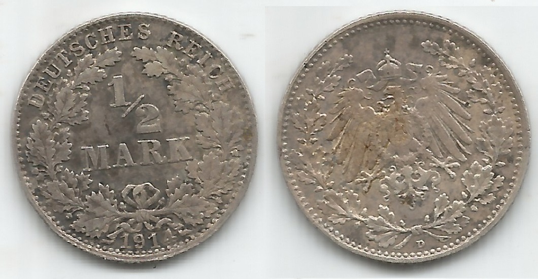 | 78173 | Alemanha, ½ Marco, 1914D, 2,77 gramas de Prata .900, KM-17, Ø 20 mm, MBC | 64,00 | Foto |