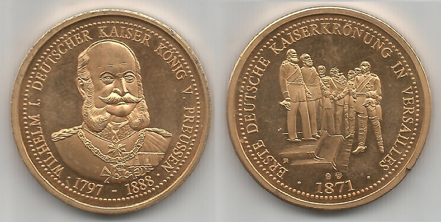 | 78269 | Alemanha, 19??, Medalha alusiva ao Kaiser Wilhelm I e sua proclamação em 1871 como Imperador Alemão no Palácio de Versalhes, Bronze, Ø 30 mm | 99,00 | Foto |