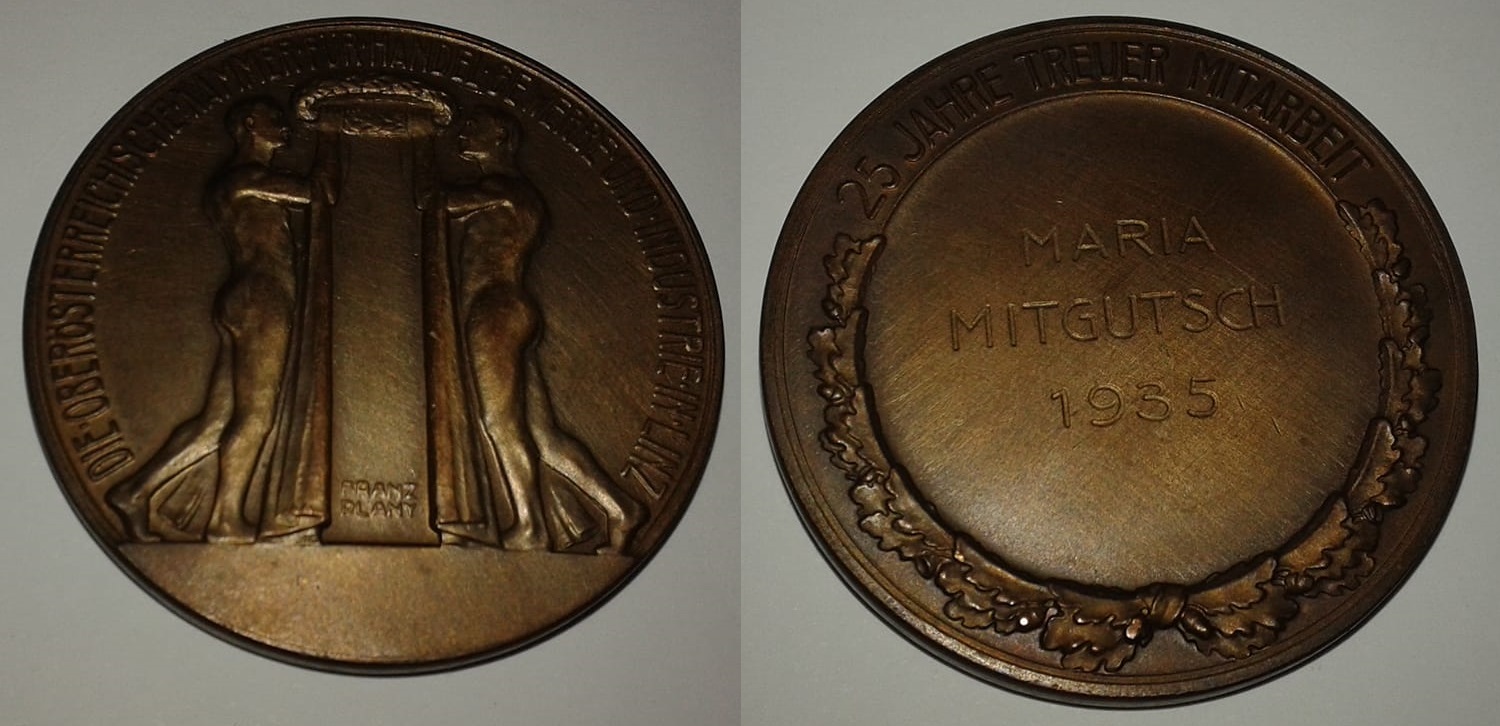 | 78294 | Áustria, 1935, medalha concedida pela Câmara Superior de Comércio e Indústria, em Linz, por 25 anos de cooperação leal, Bronze, Ø 43 mm | 120,00 | Foto |
