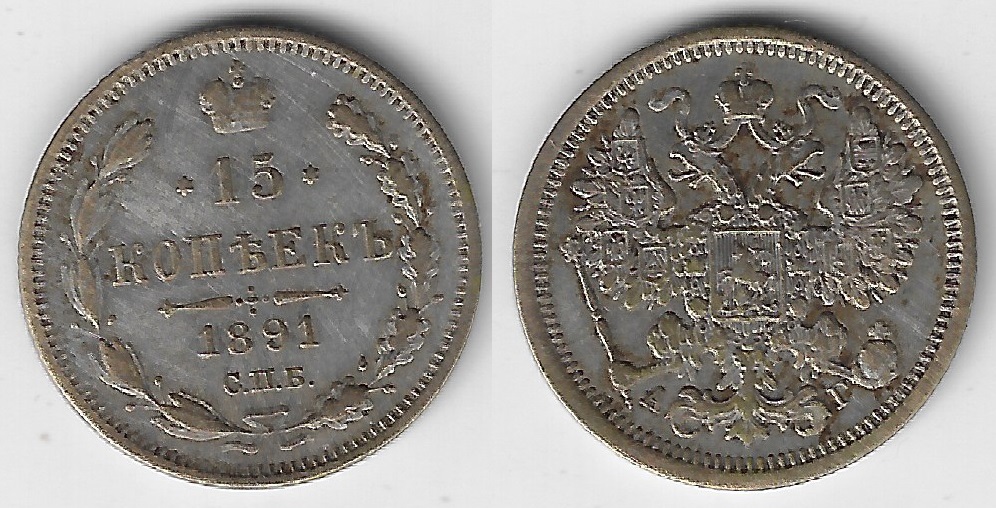 | 78693 | Rússia, 15 Kopeks, 1891, 2,6994 gramas de Prata .500, KM-21a.2, Ø 20 mm, Soberba | 128,00 | Foto |