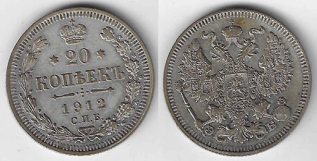 | 78694 | Rússia, 20 Kopeks, 1912, 3,6 gramas de Prata .500, KM-22a.1, Ø 22 mm, S | 99,00 | Foto |