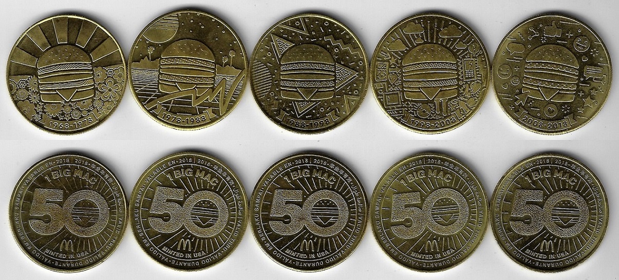 | 78751 | EUA, 2018, Coleção completa com as 5 moedas Mac Coin (vale 1 Big Mac) alusivas aos 50 Anos da McDonald´s | 250,00 | Foto |