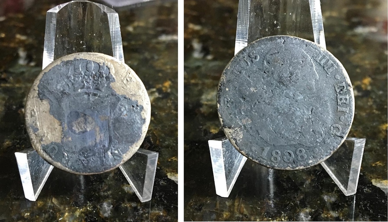 | 81039 | Espanha, 2 Reales, 1808, Rei Carolus IIII, 6,77 gramas de Prata .812, G pois está com forte desgaste e oxidada | 34,00 | Foto |