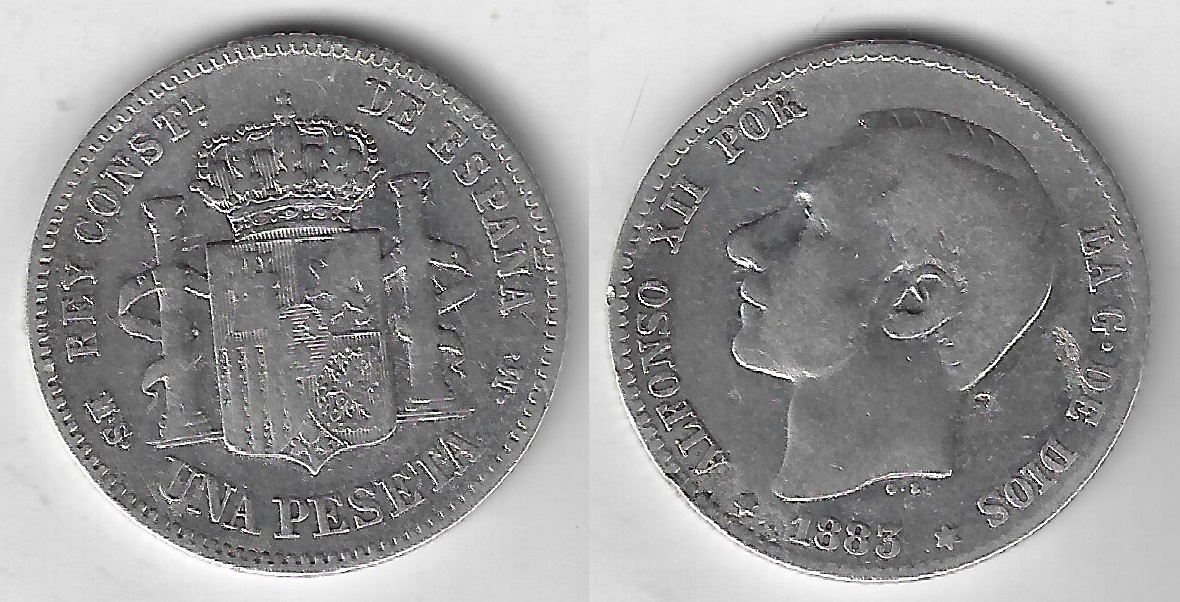 | 82535 | Espanha, 1 Peseta, 1883 MS-M, 5 gramas de Prata .835, KM-686, Ø 23 mm, MBC | 120,00 | Foto |