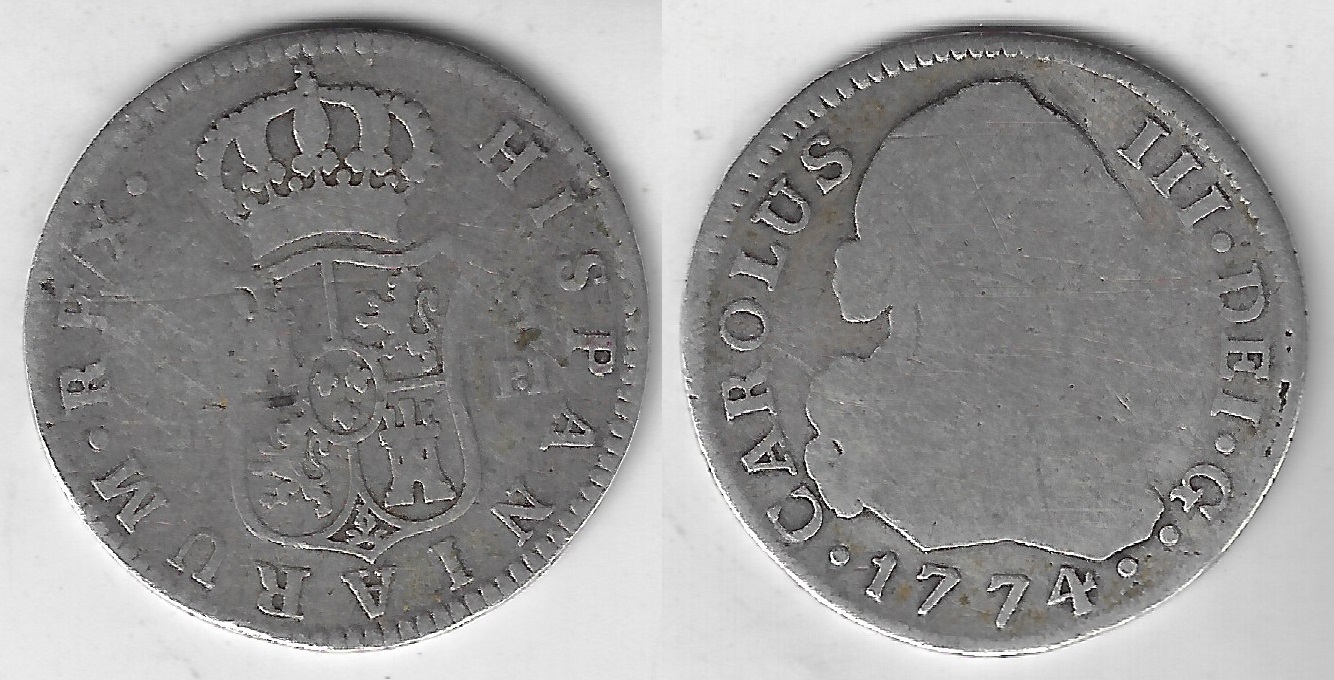 | 82536 | Espanha, 2 Reales, 1774 PJ, 6,77 gramas de Prata .833, KM-414.1, Ø 27 mm, BC | 128,00 | Foto |