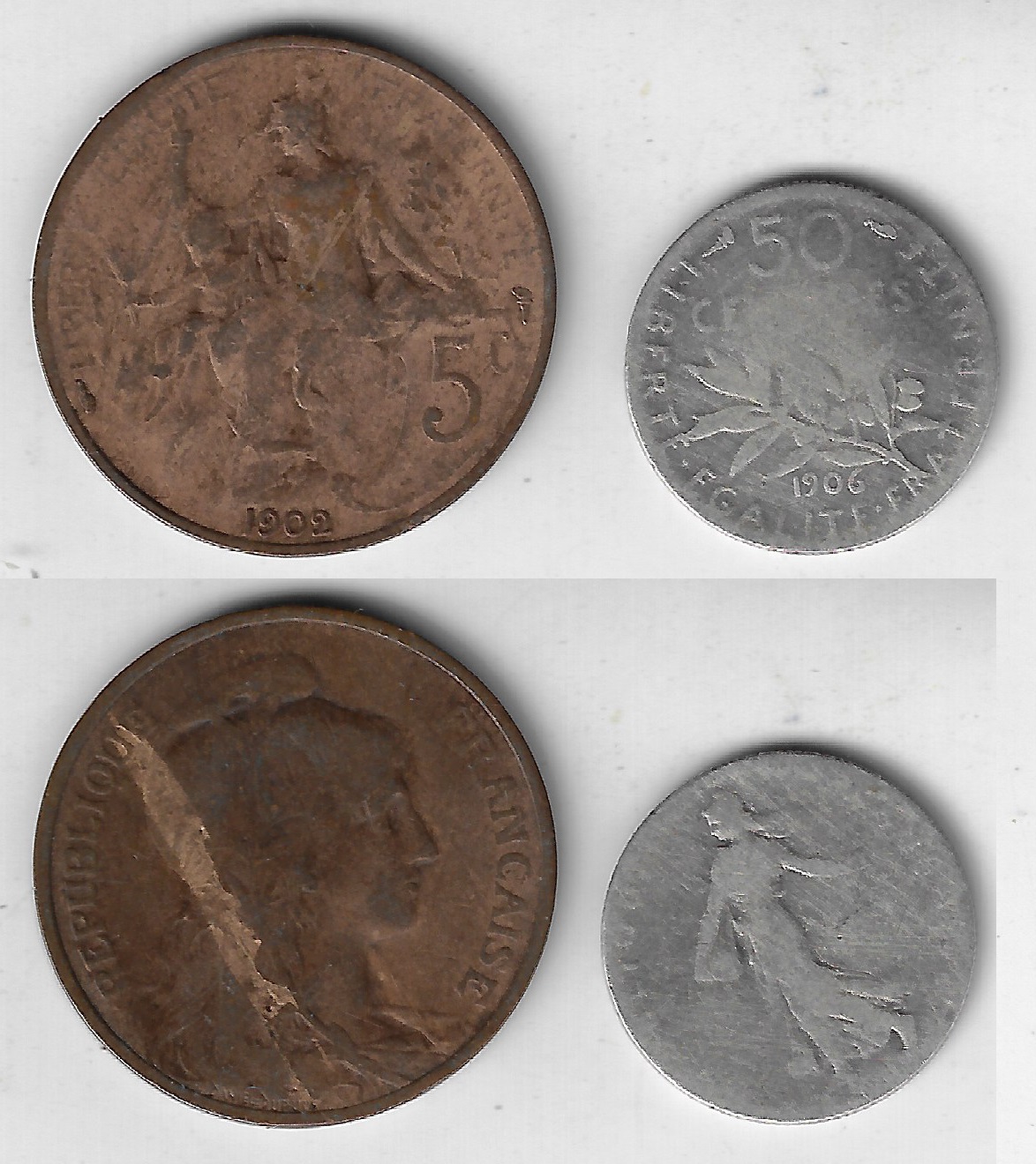 | 82551 | França, 5 Cêntimes, 1902, Bronze, KM-842, Ø 25 mm, BC e 50 Cêntimes, 1906, 2,5 gramas de Prata .835, KM-854, Ø 18 mm, BC | 21,00 | Foto |