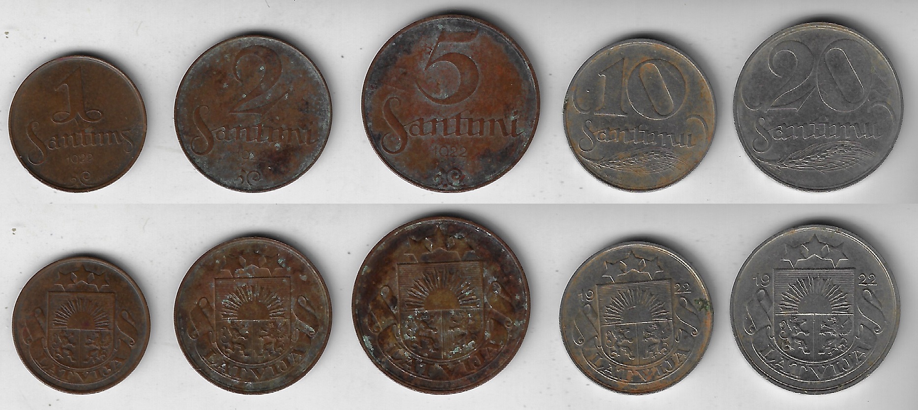 | 84107 | Letônia, 1, 2, 5, 10 e 20 Santims, 1922, KM-1, 2, 3, 4 e 5, Bronze e Níquel, Ø 17 a 22 mm, MBC (US$23) | 129,00 | Foto |