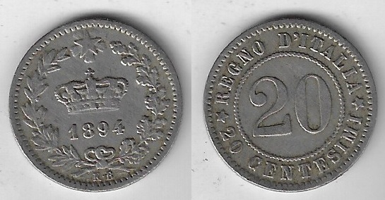 | 84110 | Itália, 20 Centésimi, 1894 KB, Cupro-Níquel, Ø 21 mm, MBC | 28,00 | Foto |