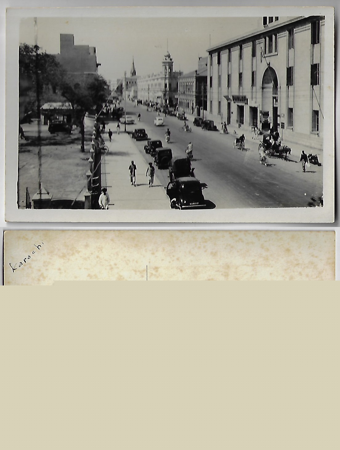 | 38203 | Paquistão, 1940s, cartão postal com foto preto e branco da Rua McLeod (atualmente Rua Ibrahim Ismail Chundrigar) e Edifício da Dunlop Pneus, em Karachi, papel fotográfico Gevaert | 10,00 | Foto |