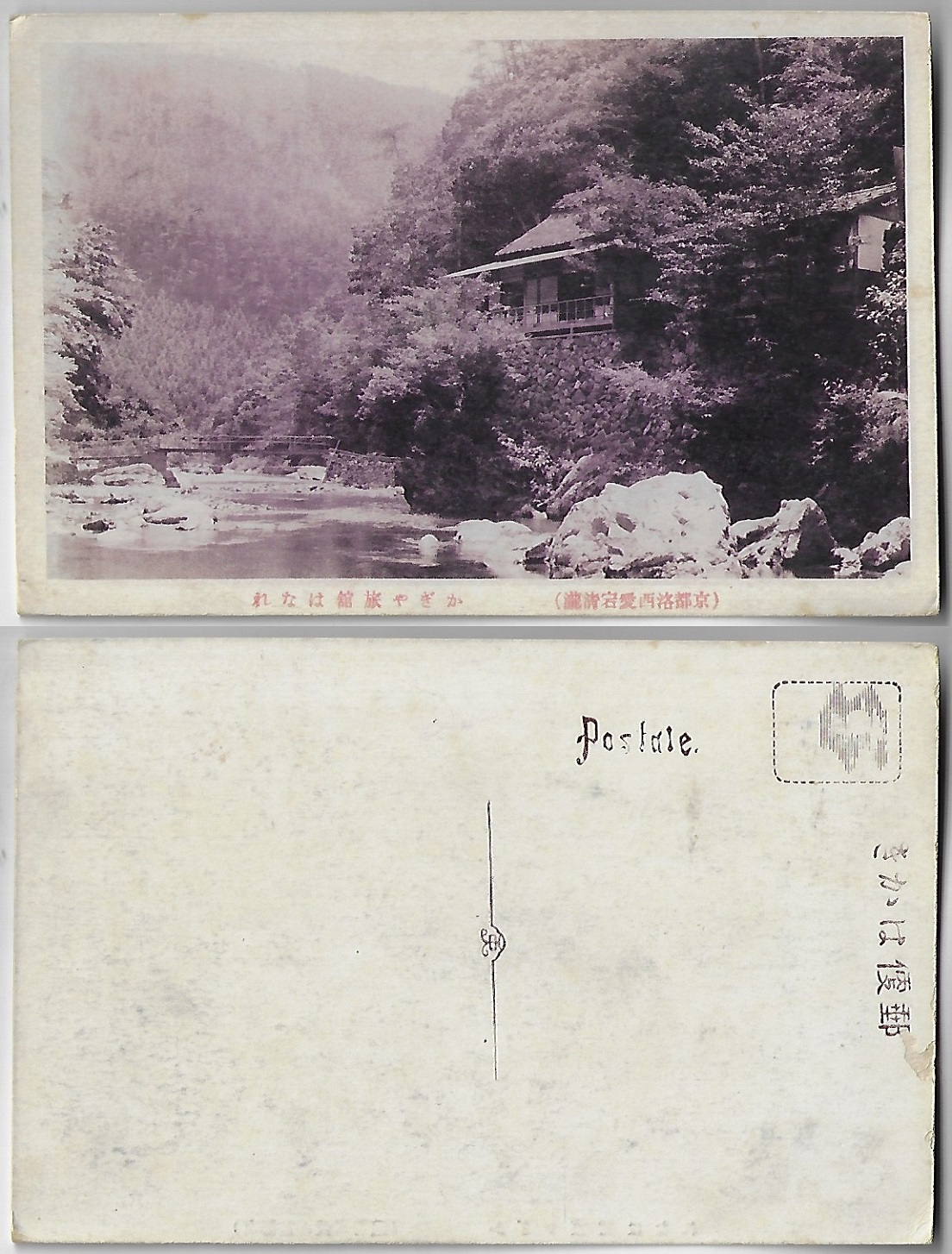| 49723 | Japão, 1910s, cartão postal com foto preto e branco de paisagem com rio, ponte e pousada em meio à natureza, possivelmente em Kyoto, sem uso | 10,00 | Foto |