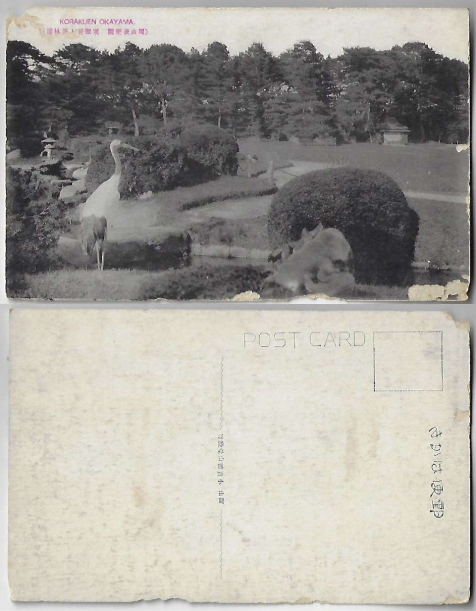| 49729 | Japão, 1920s, cartão postal com foto preto e branco do Jardim Korakuen, em Okayama, ave Grou-Japonês em destaque, sem uso, com roídos | 10,00 | Foto |