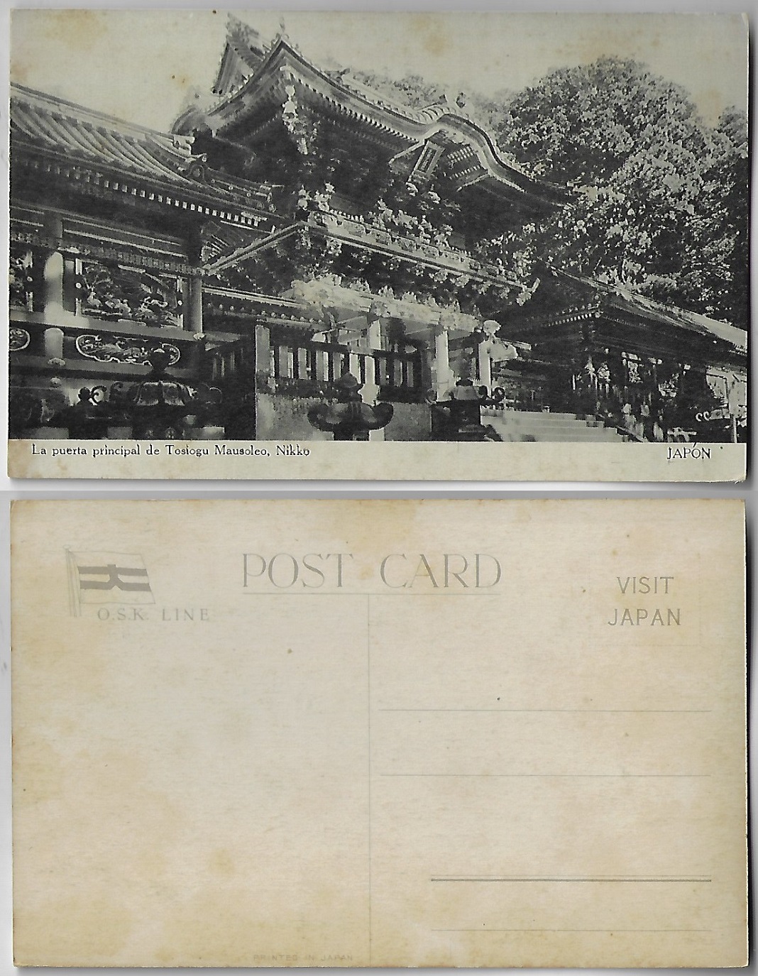 | 63998 | Japão, 1930s, cartão postal com foto preto e branco do portão principal do Santuário Toshogu, memorial a Tokugawa Ieyasu, em Nikko, Edição da Osaka Shosen Kaisha Line, sem uso | 10,00 | Foto |