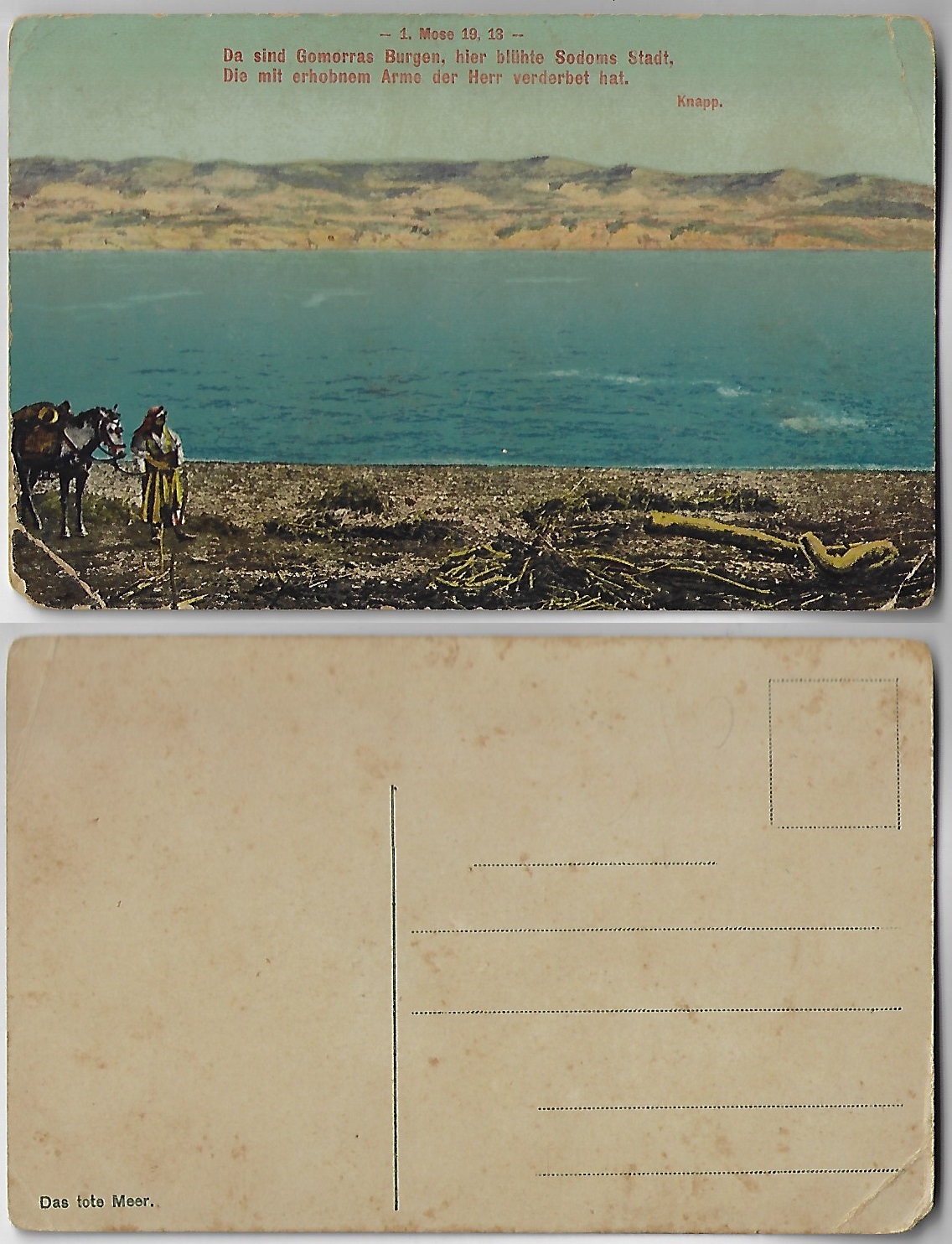 | 64906 | Israel, 1920s, cartão postal com foto colorizada do Mar Morto, com trecho da Bíblia, Gênesis 19:13, sem uso | 10,00 | Foto |