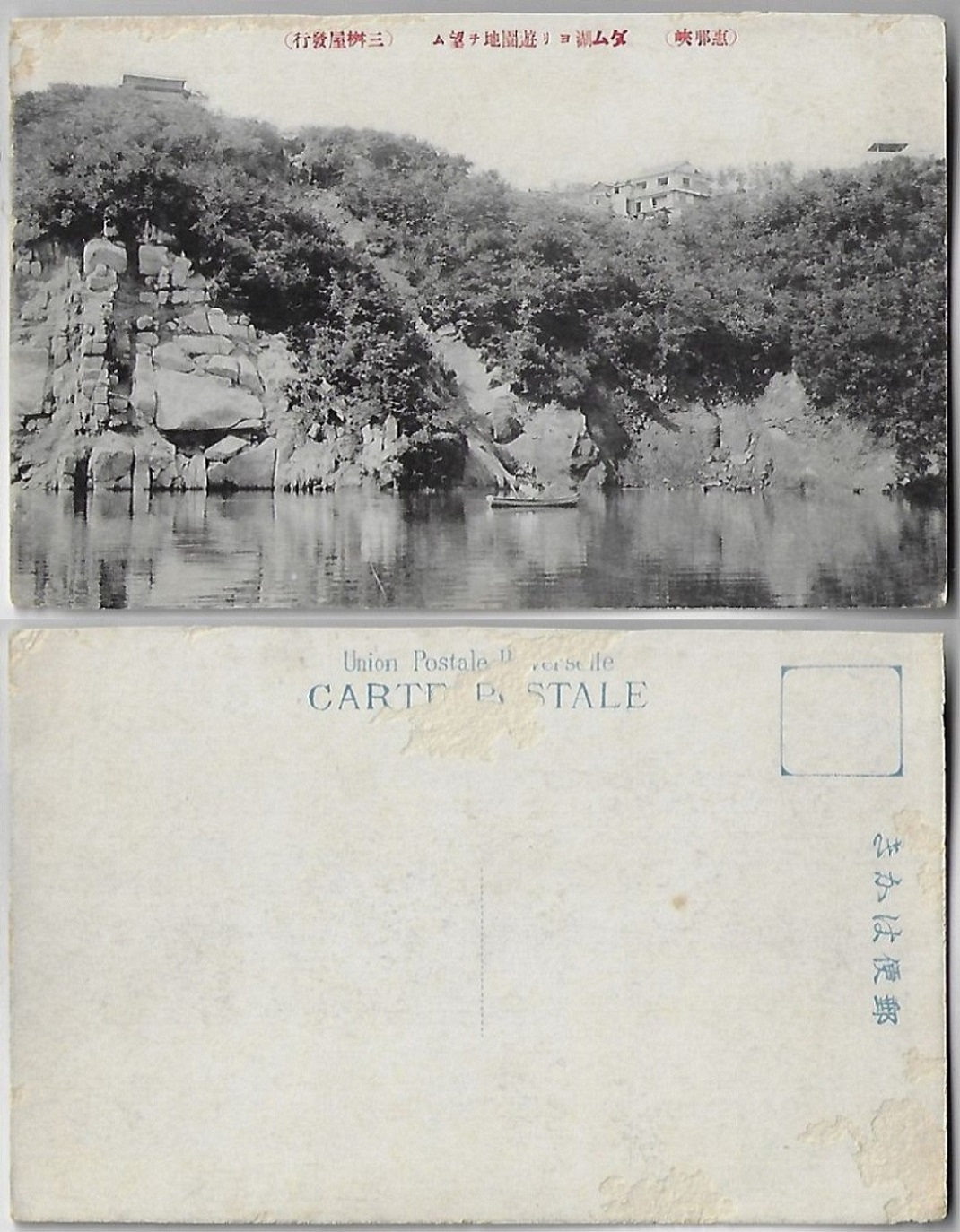 | 76320 | Japão, 1910s, cartão postal com foto preto e branco de paisagem de casas junto a margem rochosa de um lago, sem uso | 10,00 | Foto |