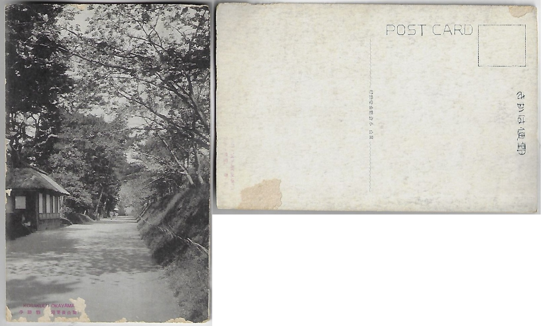 | 77410 | Japão, 1920s, cartão postal com foto preto e branco do Jardim Korakuen, em Okayama, rua com árvores em destaque, sem uso, com roídos | 10,00 | Foto |