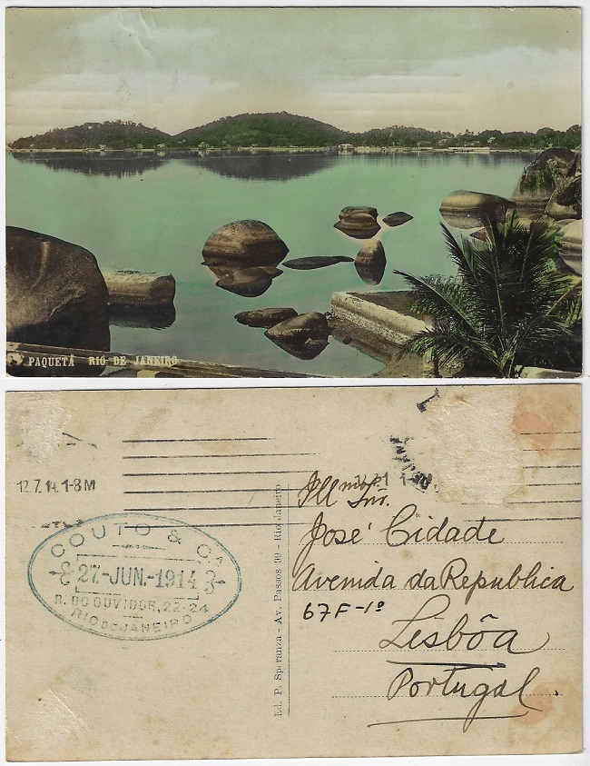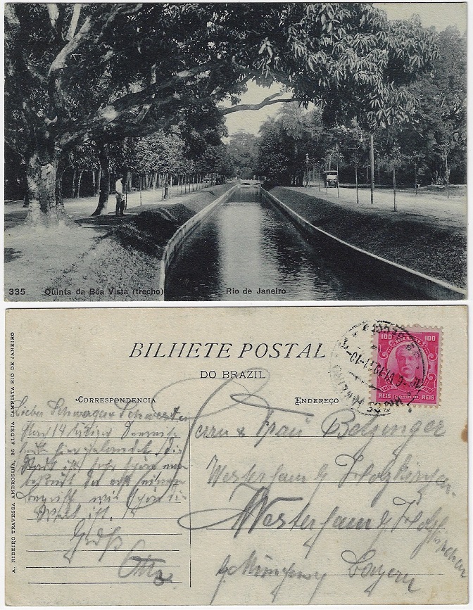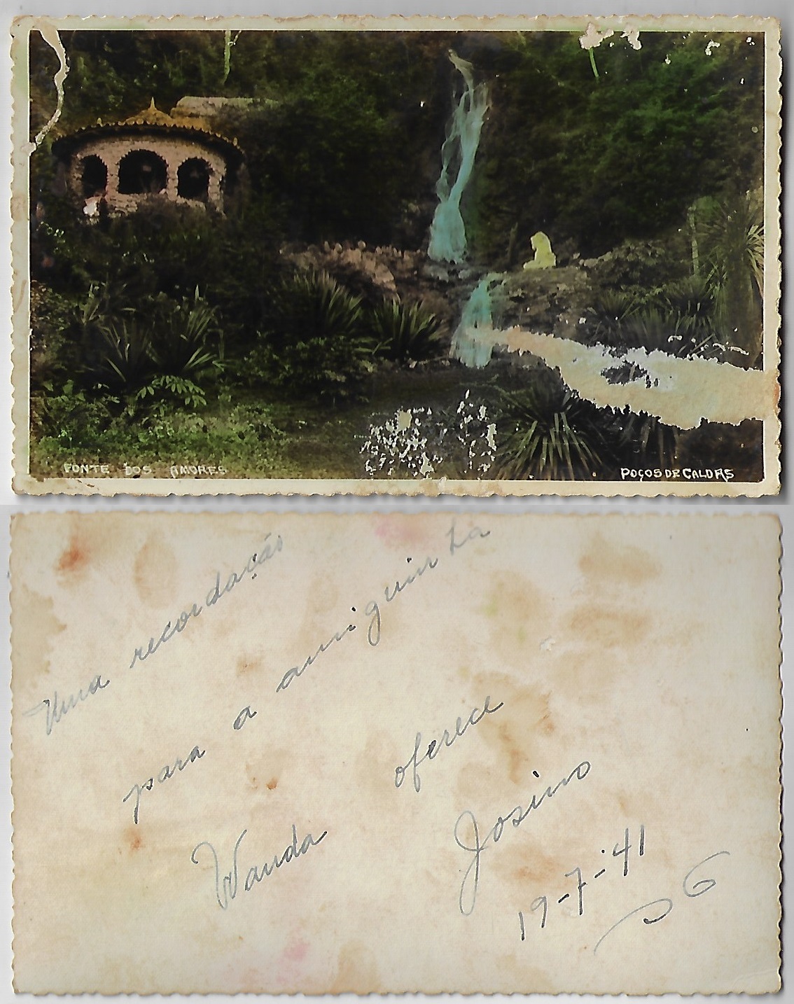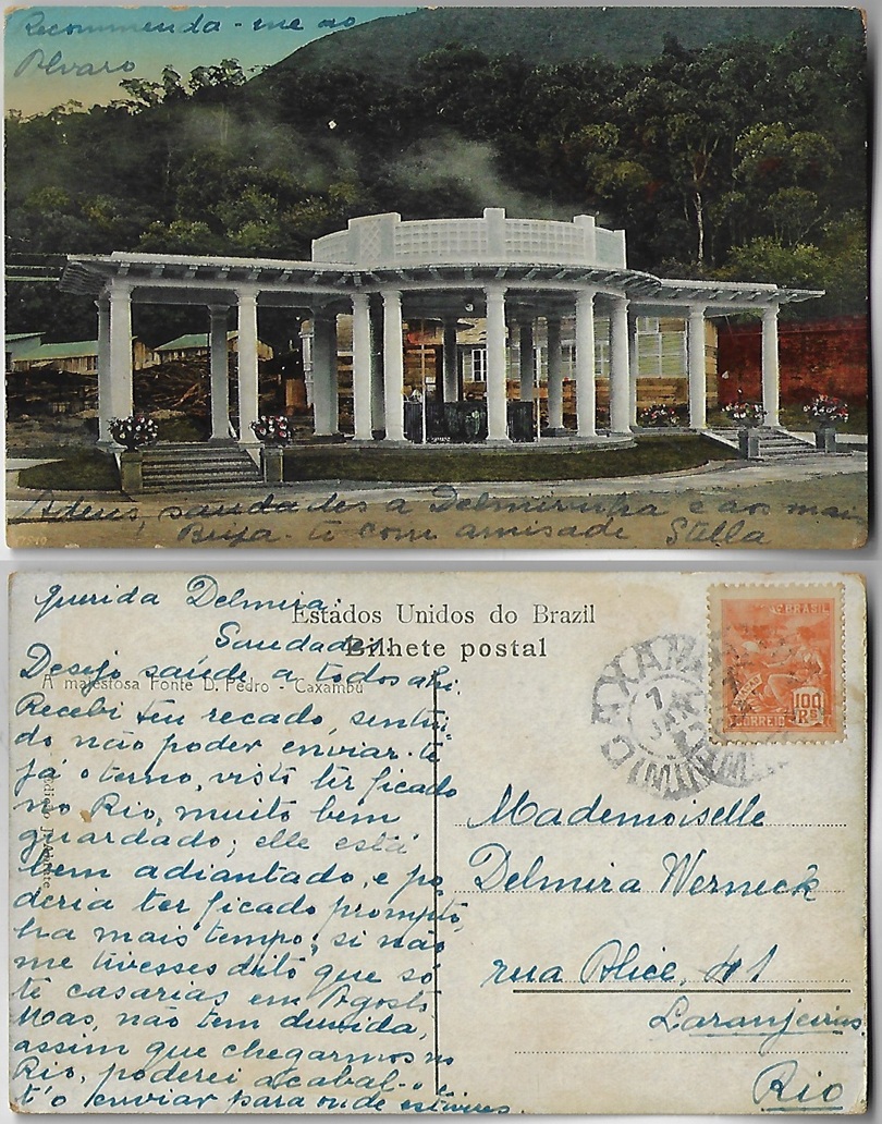 | 79435 | MG, 1920s, cartão postal com foto colorizada da Fonte D. Pedro, em Caxambu, Editor J. Abrate, nº 7510, enviado de Caxambu (7/1) para o Rio de Janeiro, porteado com selo Vovó 100 Réis | 30,00 | Foto |