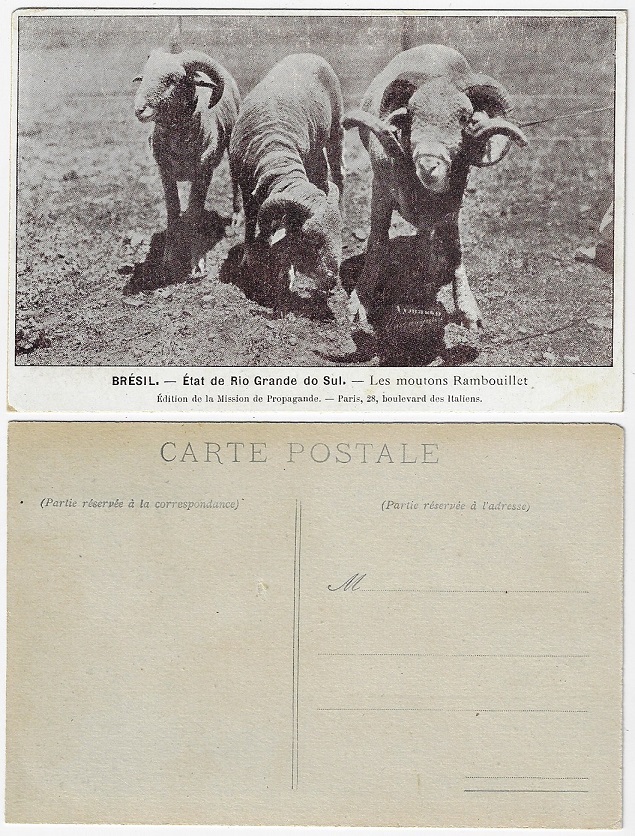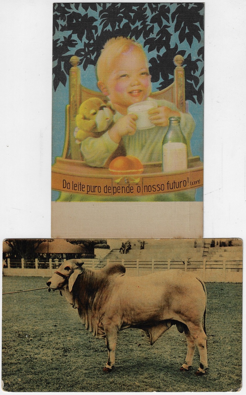 | 50252 | SP, 1930s, Cartão Postal com foto colorizada retratando touro Latego reprodutor da raça Mocha Nacional, propaganda do Departamento de Indústria Animal, Editora Graphicars, sem uso | 20,00 | Foto |