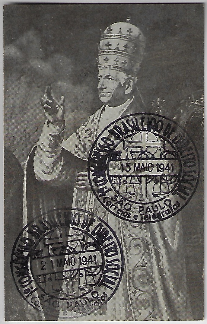 | 79655 | SP, 1941, cartão postal com imagem do Papa Leão XIII de lembrança do Primeiro Congresso Brasileiro de Direito Social, em São Paulo, carimbo comemorativo | 10,00 | Foto |