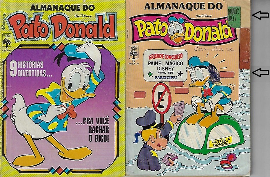 | 81435 | Brasil, 1987/1989, quadrinhos "Almanaque do Pato Donald", nº 2 e 10, Editora Abril, 84 páginas cada, nº 10 com selo recortado da capa e pequeno rabisco | 20,00 | Foto |