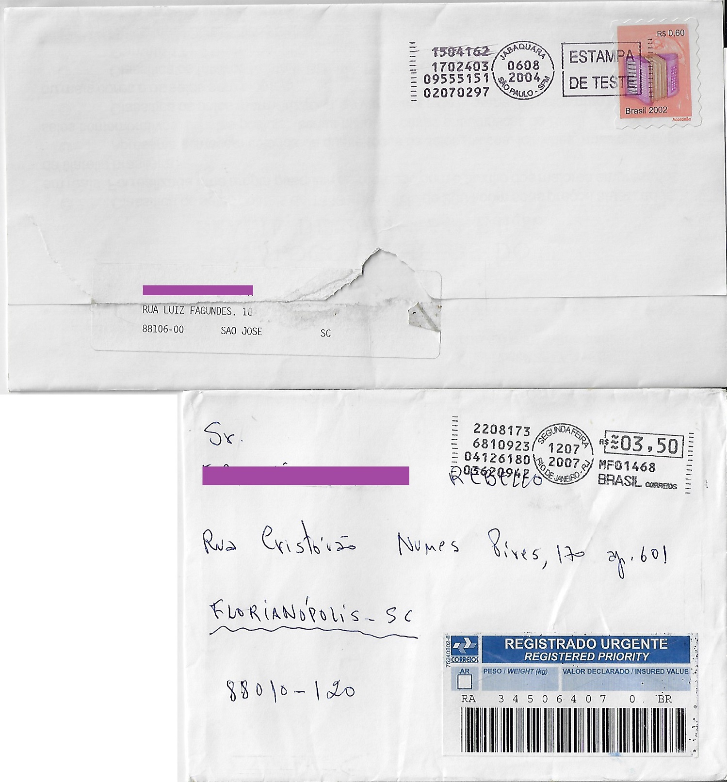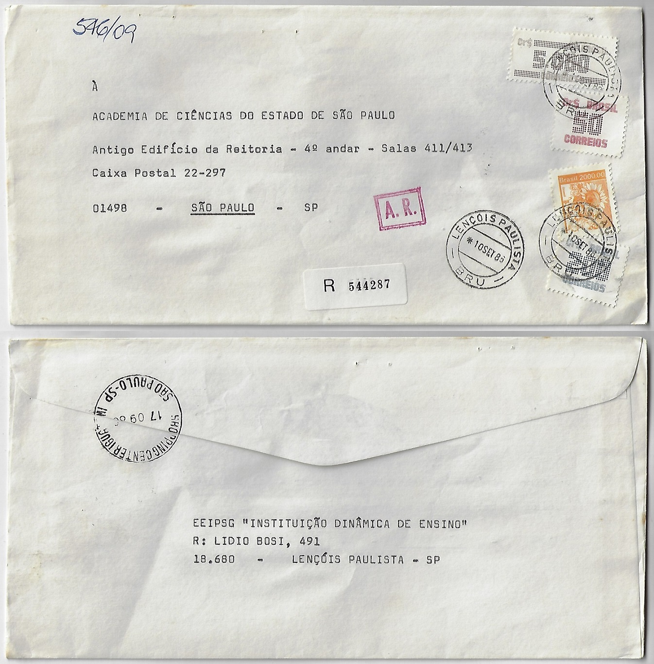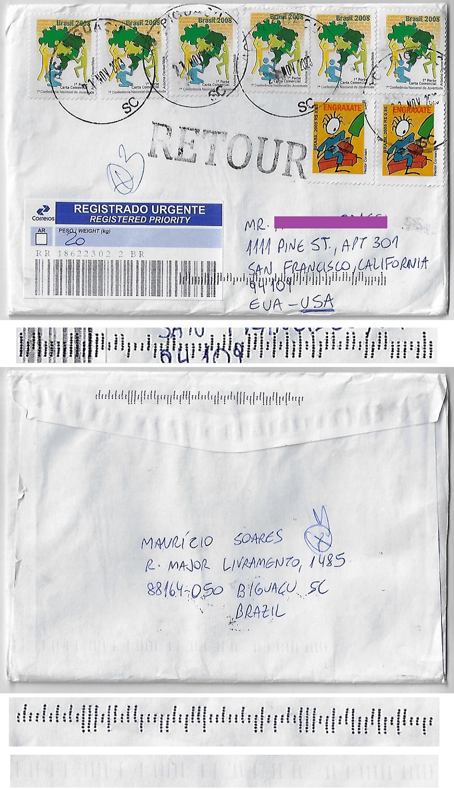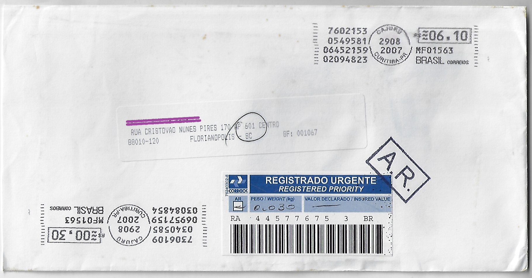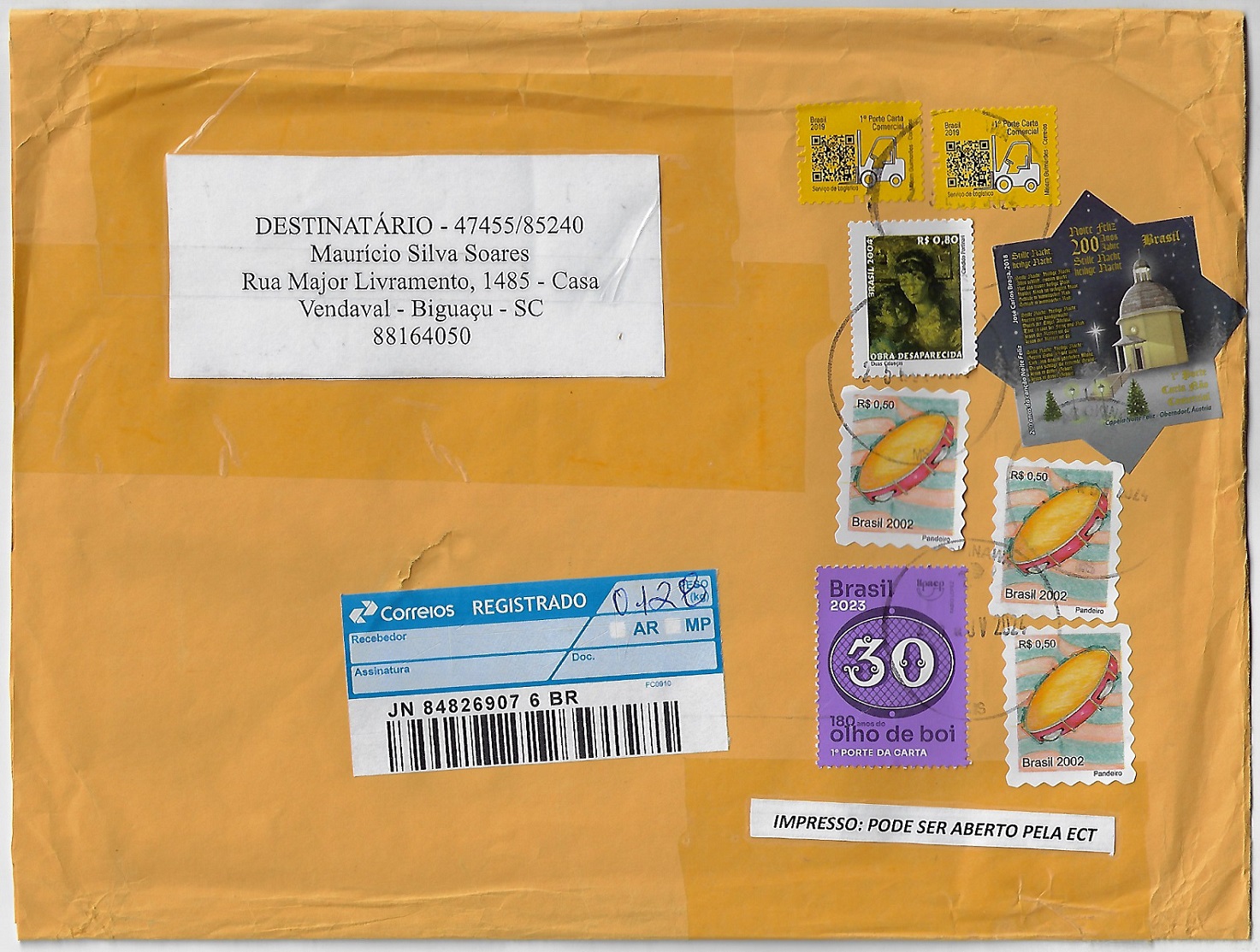 | 80884 | 2023, envelope prioritário registrado enviado de Biguaçu (21/11) para San Francisco / EUA, retornado ao remetente, marcas de triagem eletrônica na frente e no verso, 5 selos comemorativos 1ª Conferência Nacional da Juventure e 2 regulares Engraxate | 10,00 | Foto |