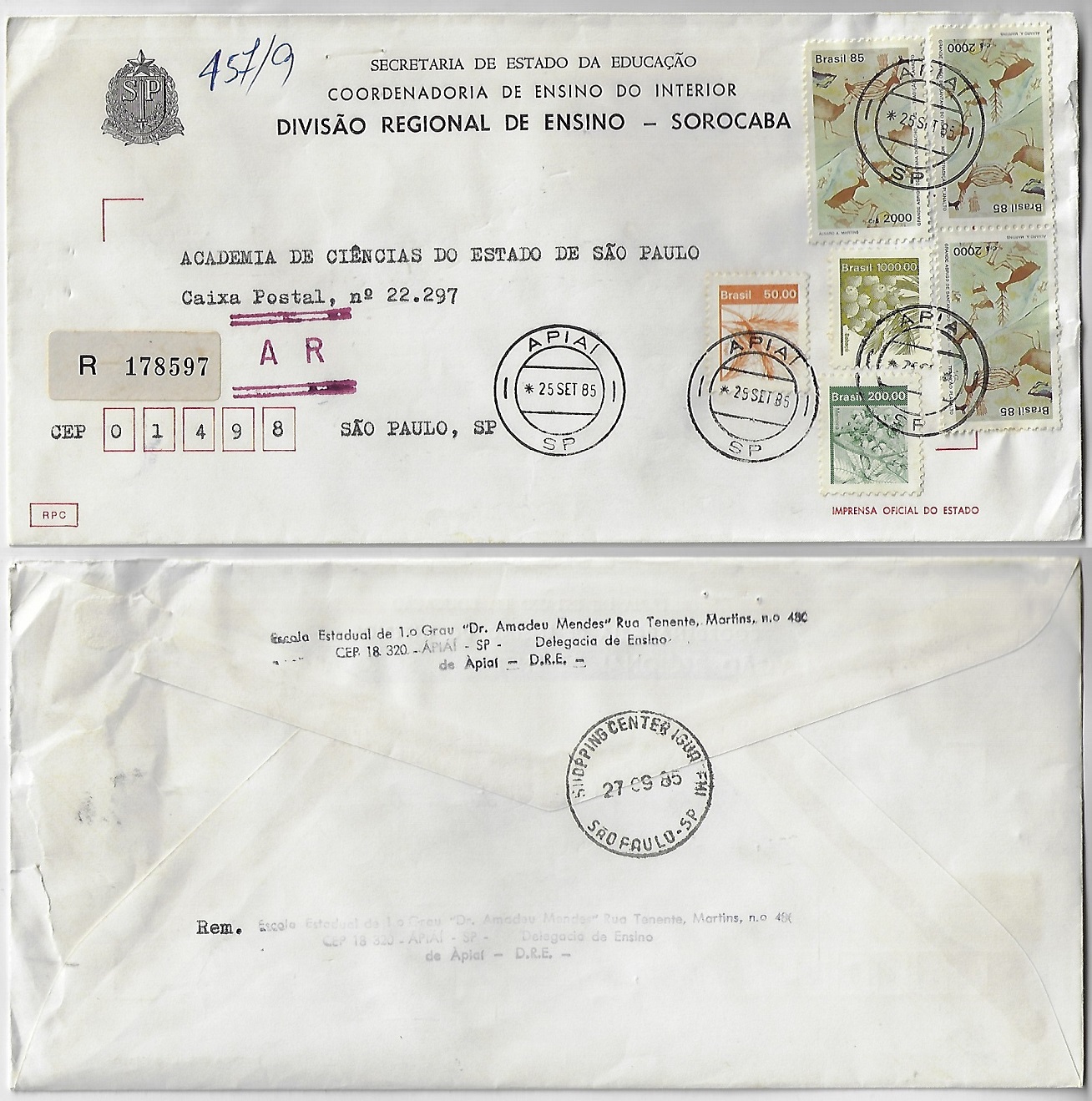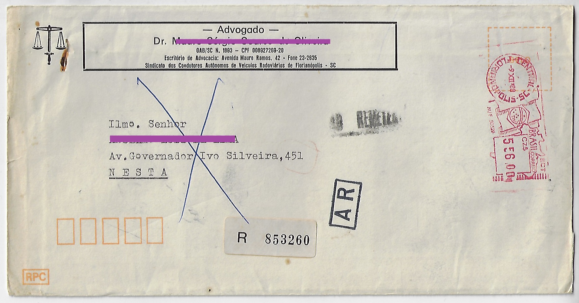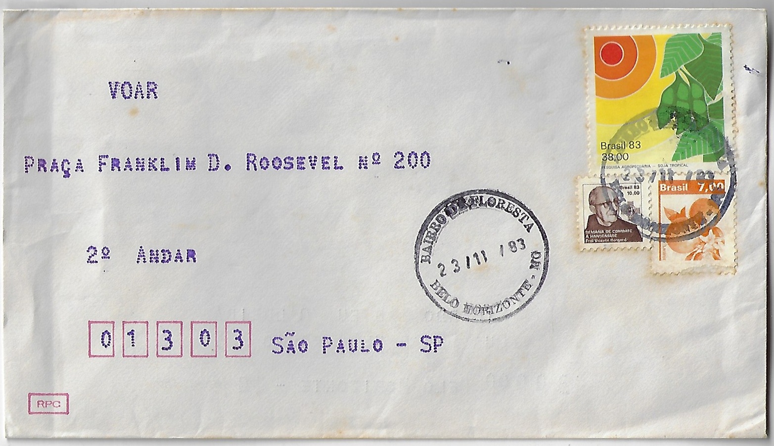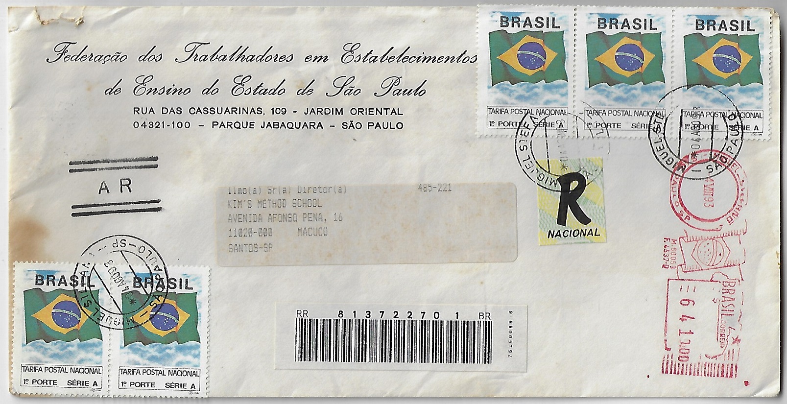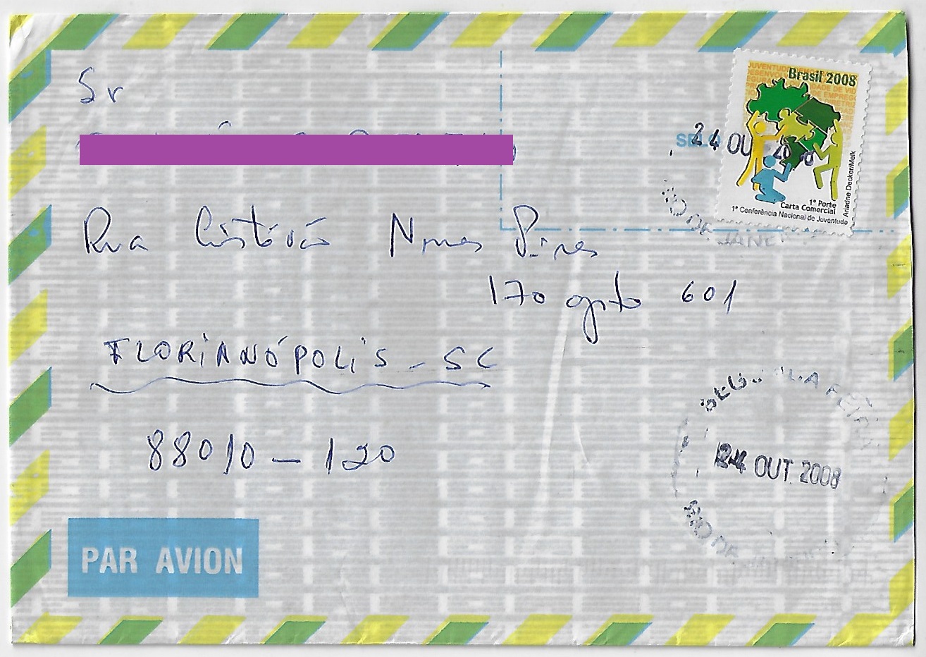 | 80884 | 2023, envelope prioritário registrado enviado de Biguaçu (21/11) para San Francisco / EUA, retornado ao remetente, marcas de triagem eletrônica na frente e no verso, 5 selos comemorativos 1ª Conferência Nacional da Juventure e 2 regulares Engraxate | 10,00 | Foto |