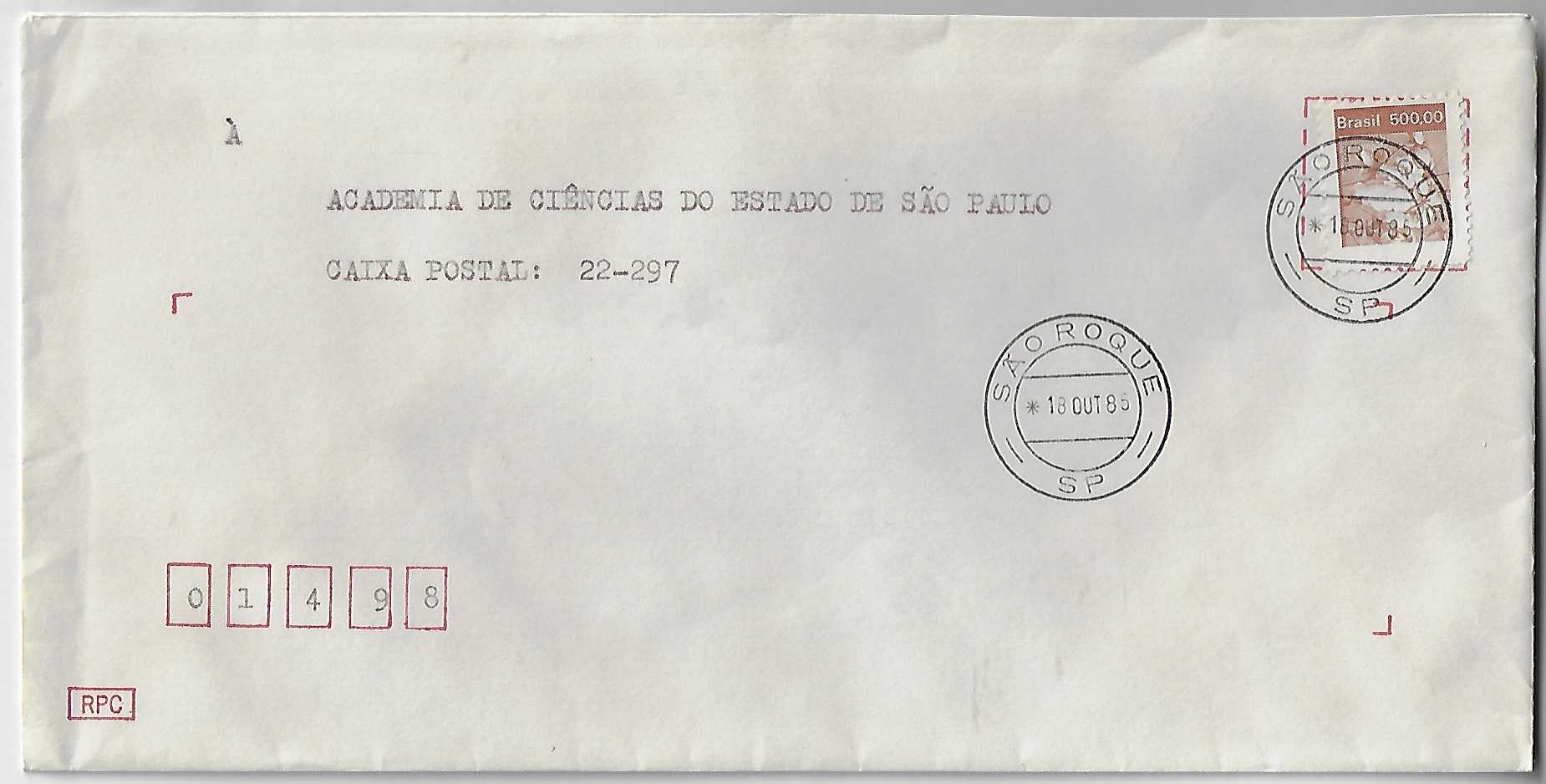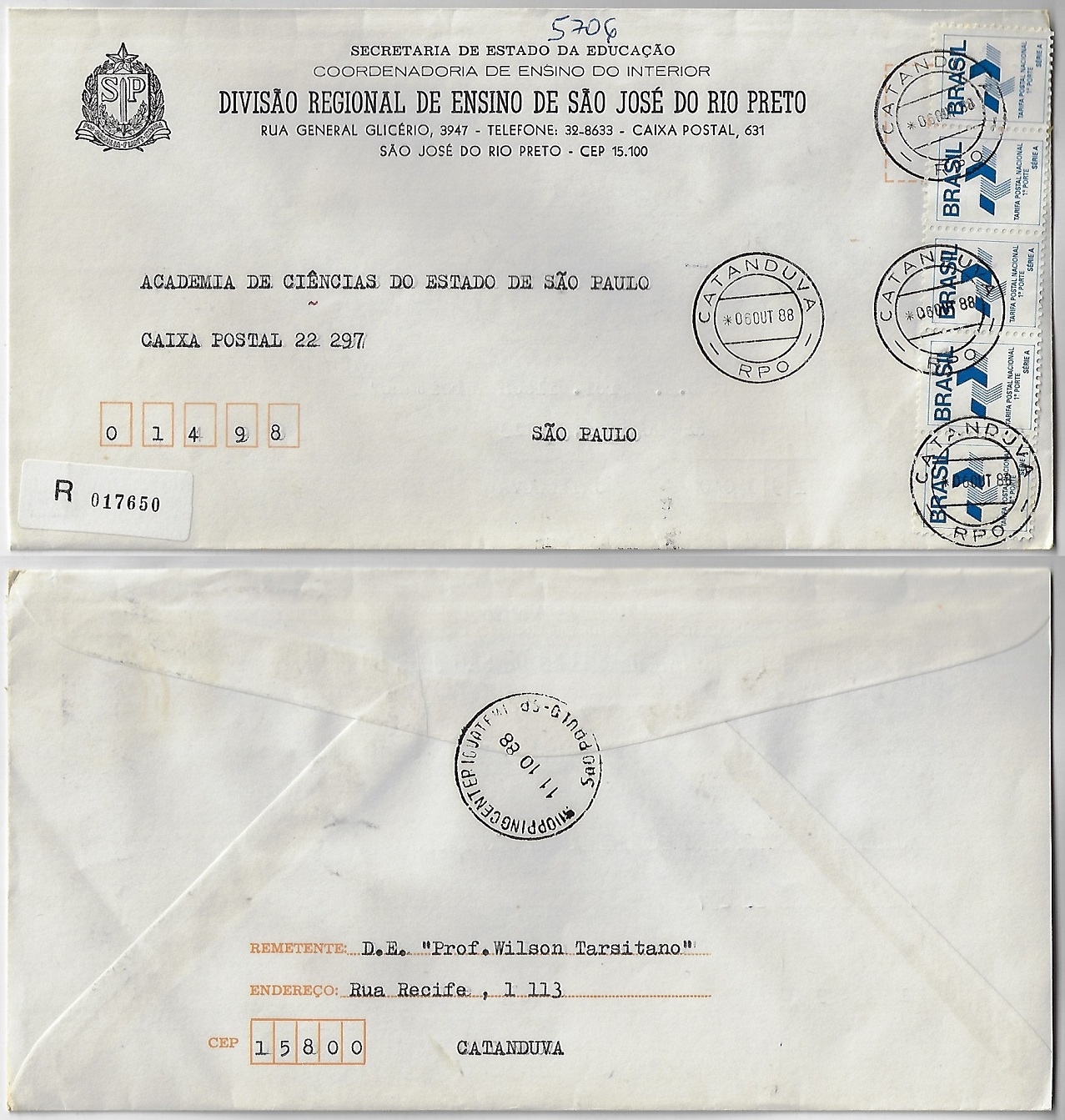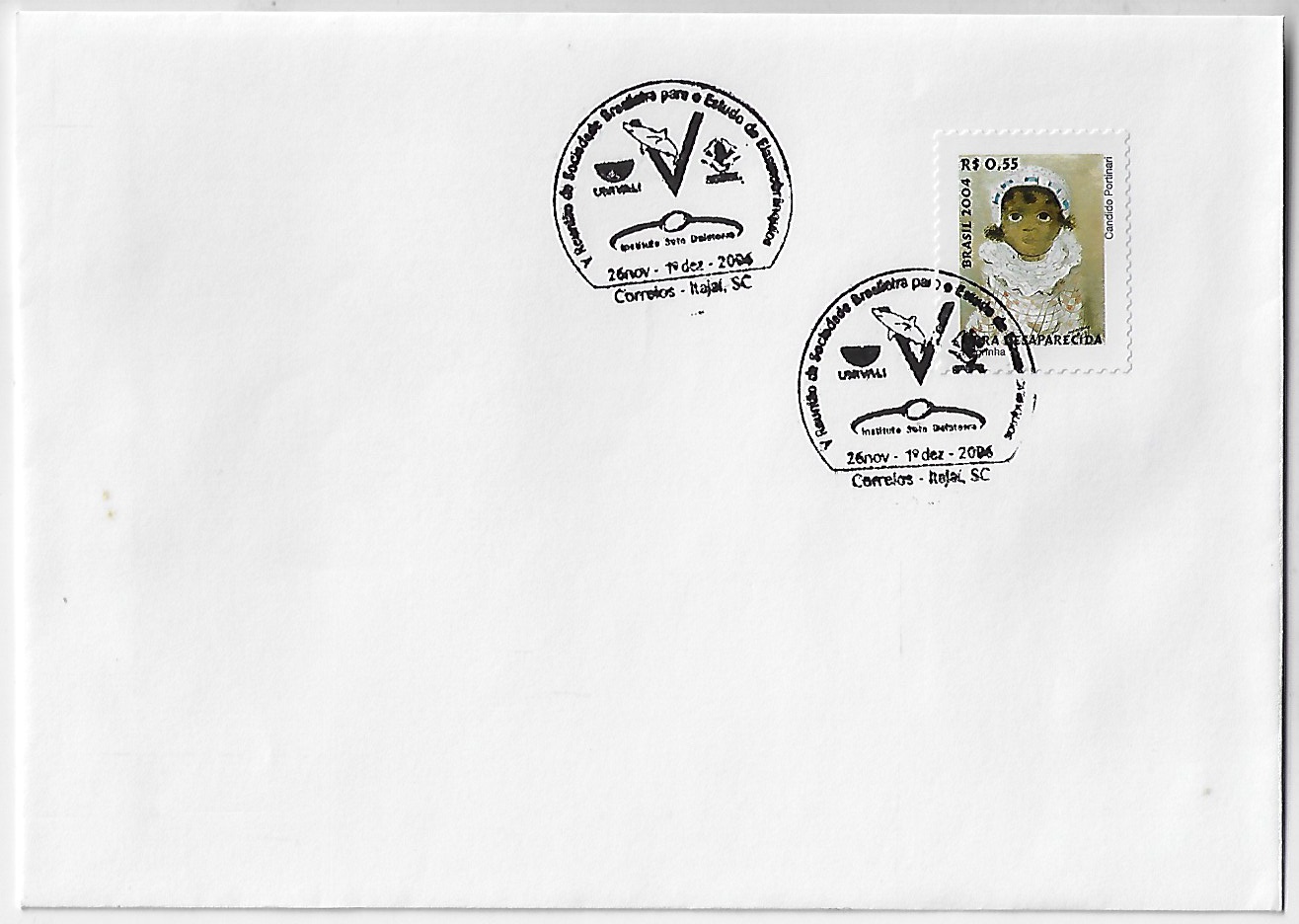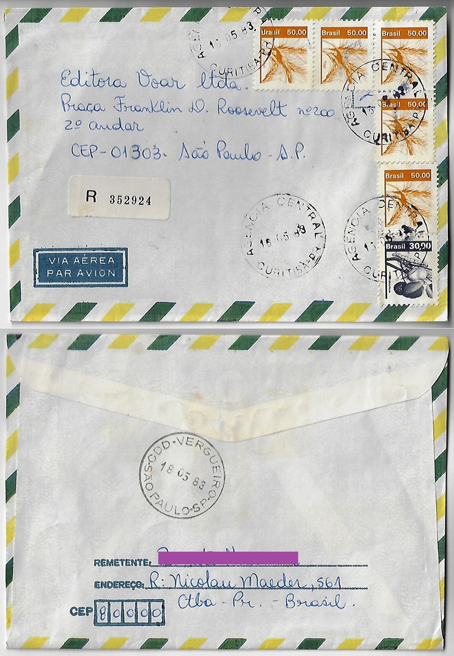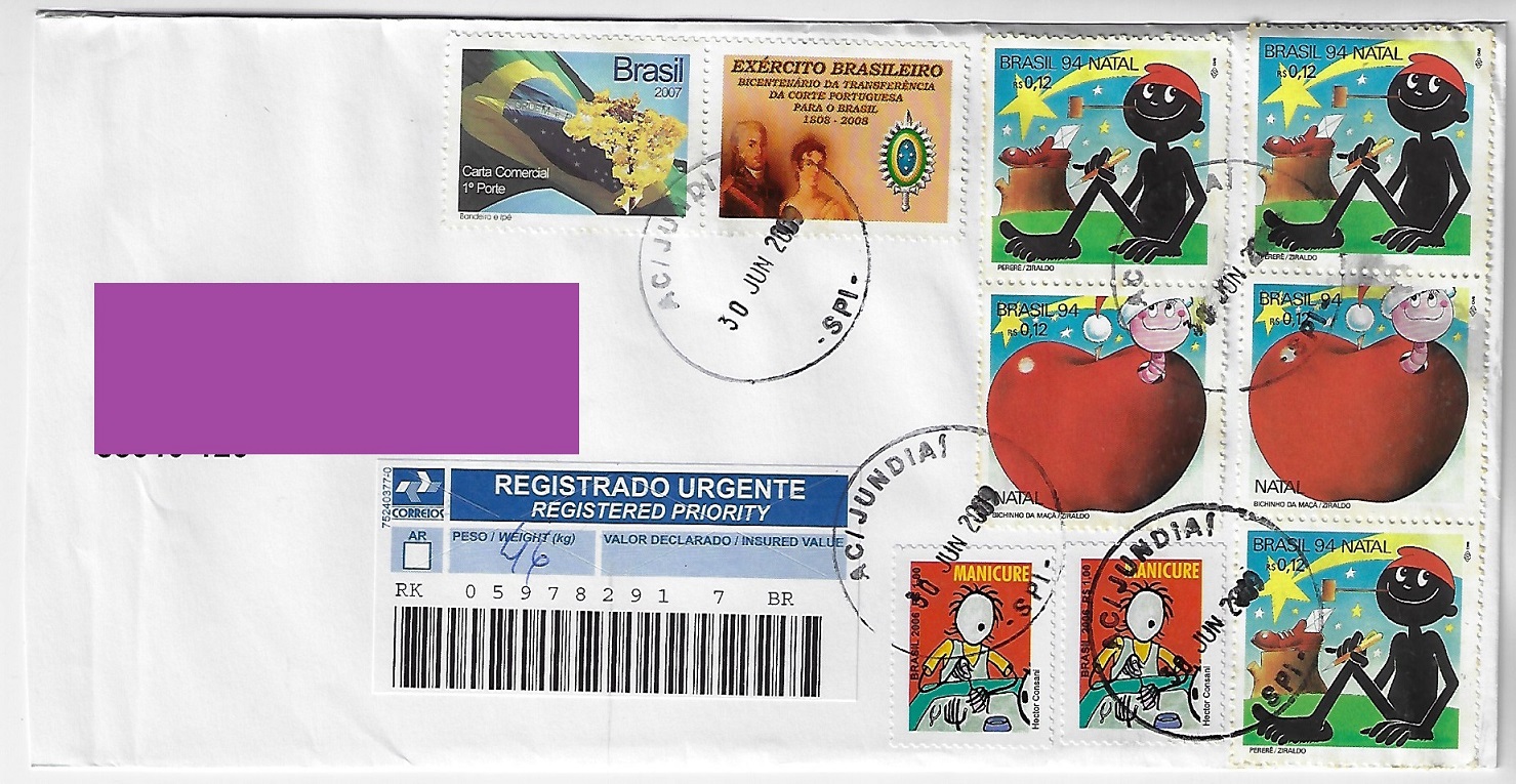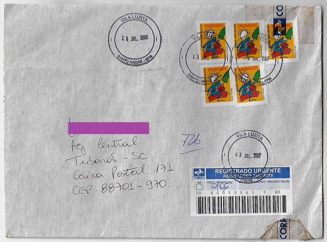 | 80884 | 2023, envelope prioritário registrado enviado de Biguaçu (21/11) para San Francisco / EUA, retornado ao remetente, marcas de triagem eletrônica na frente e no verso, 5 selos comemorativos 1ª Conferência Nacional da Juventure e 2 regulares Engraxate | 10,00 | Foto |