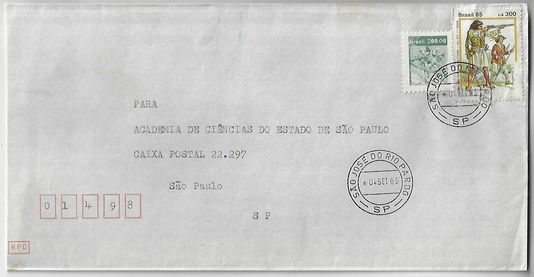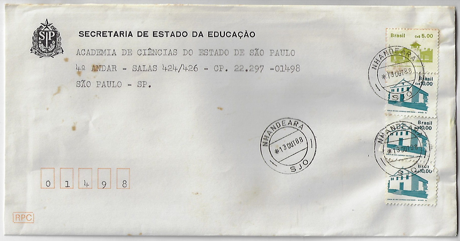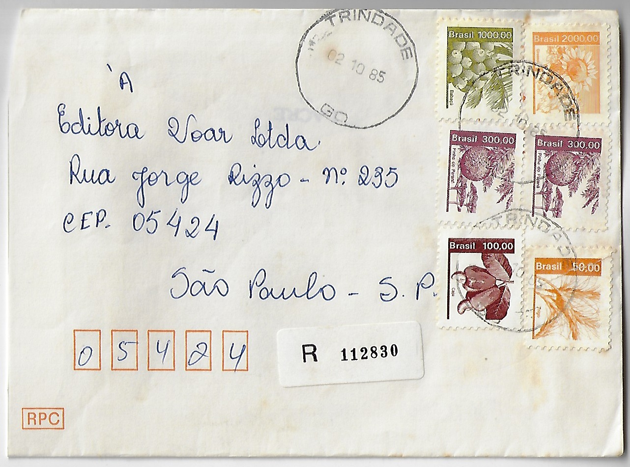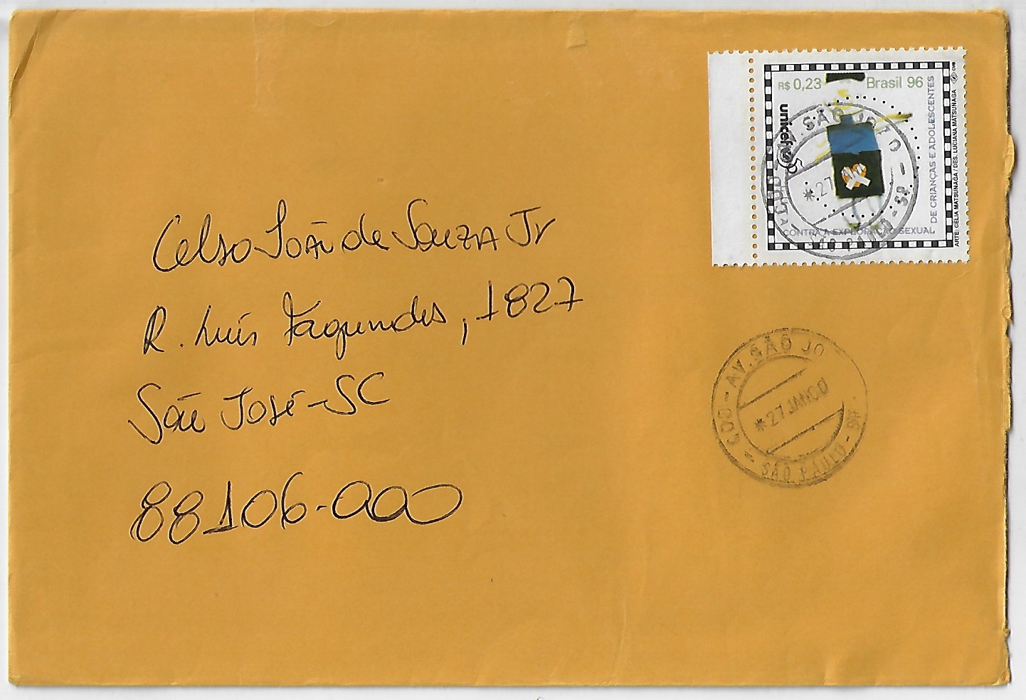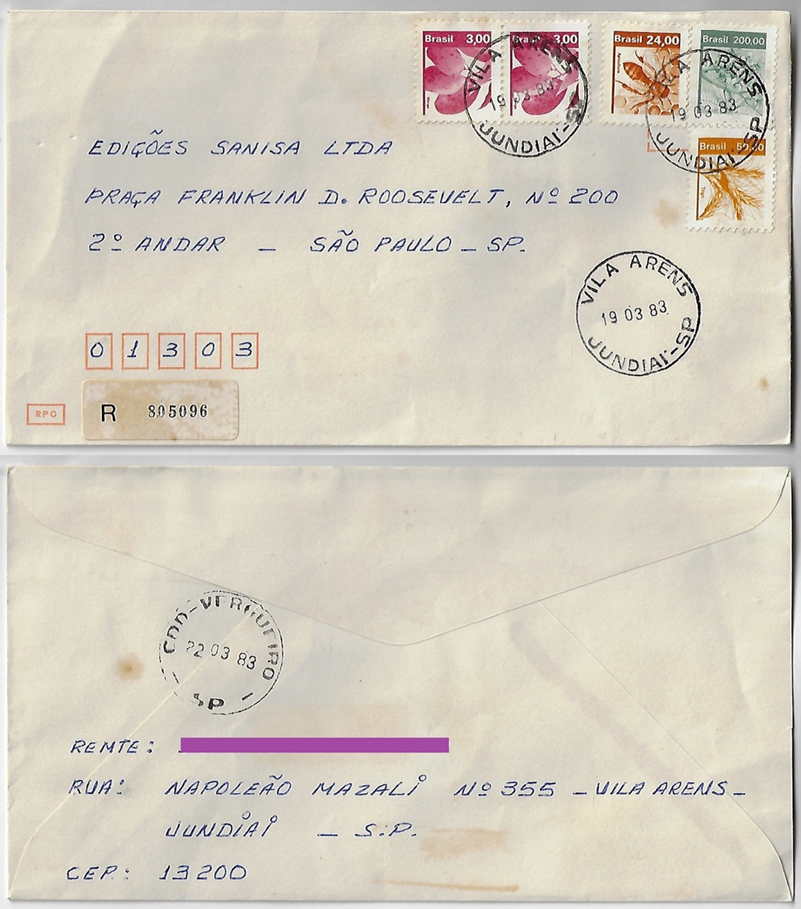 | 80884 | 2023, envelope prioritário registrado enviado de Biguaçu (21/11) para San Francisco / EUA, retornado ao remetente, marcas de triagem eletrônica na frente e no verso, 5 selos comemorativos 1ª Conferência Nacional da Juventure e 2 regulares Engraxate | 10,00 | Foto |