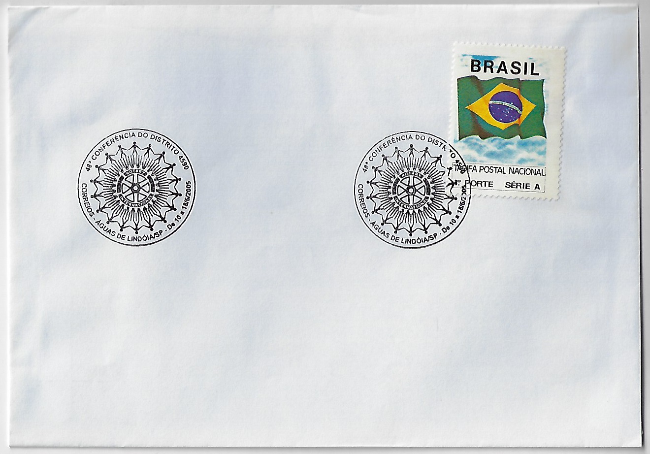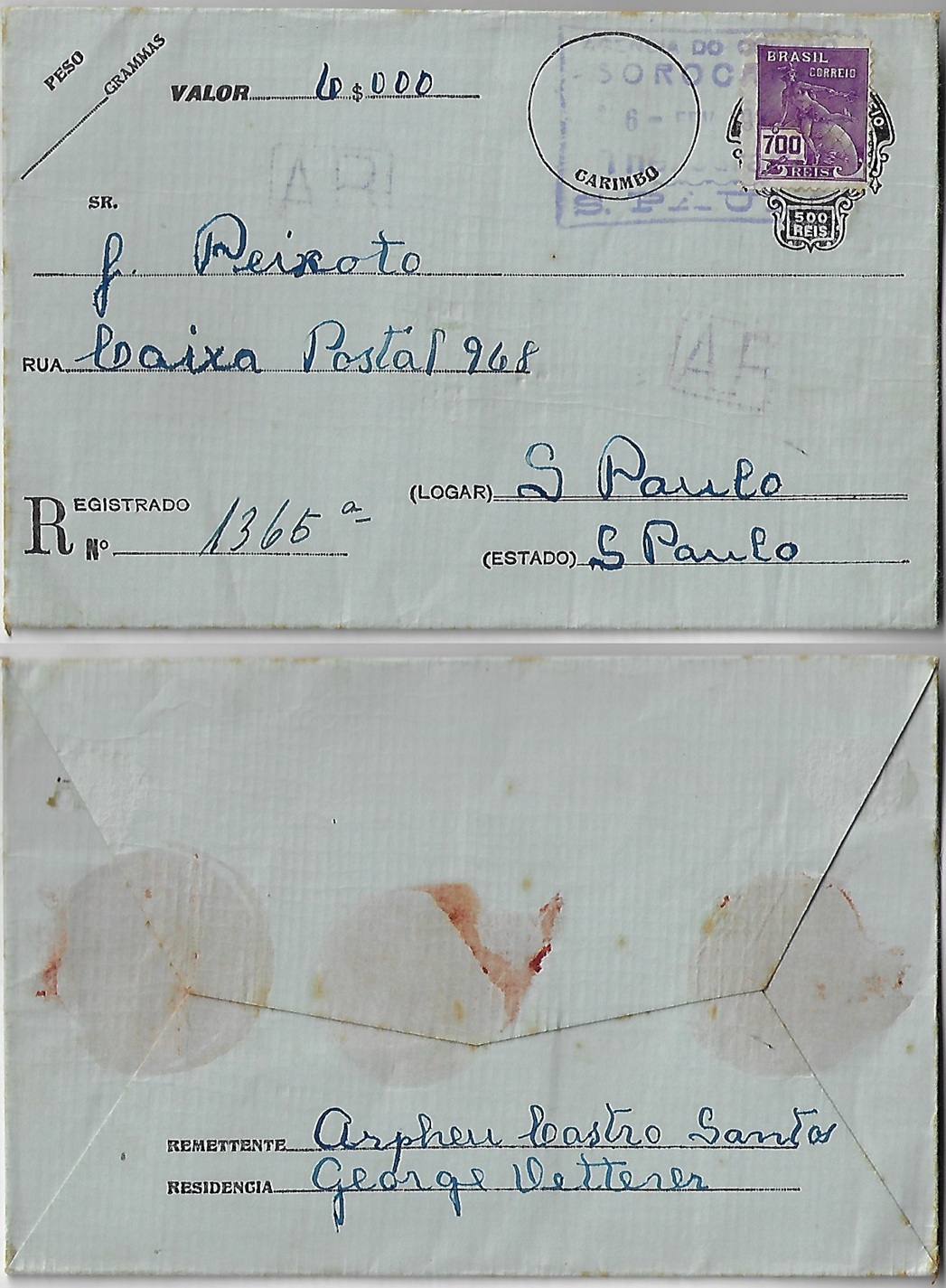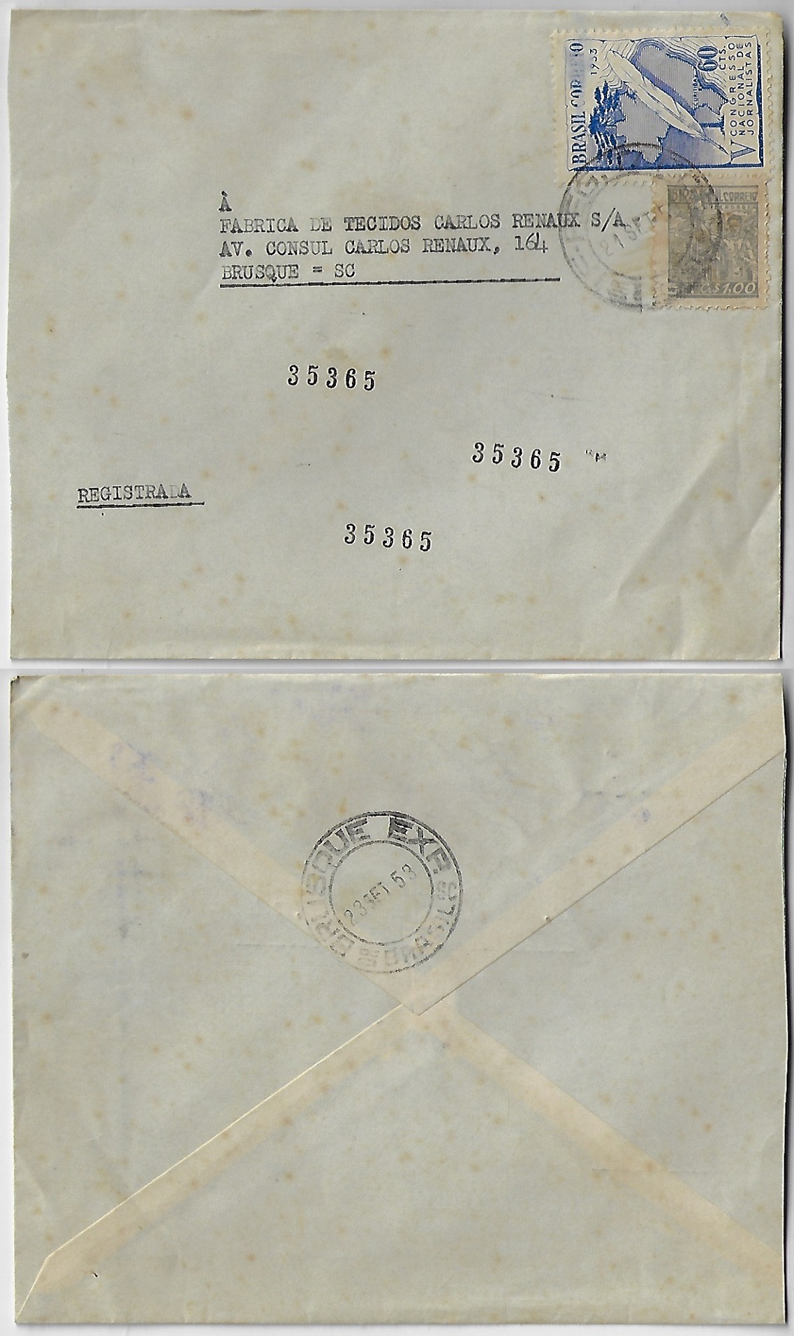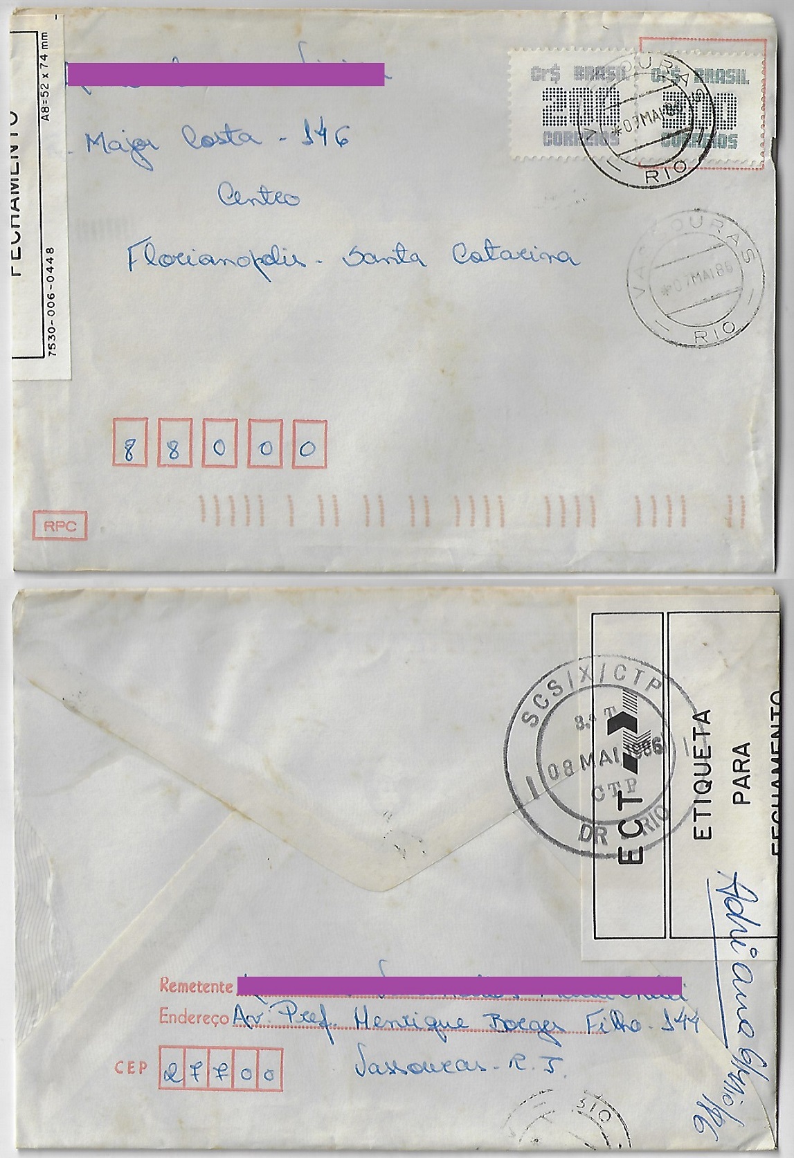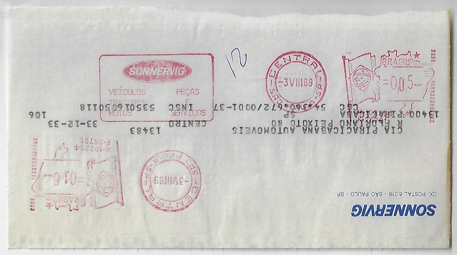 | 80884 | 2023, envelope prioritário registrado enviado de Biguaçu (21/11) para San Francisco / EUA, retornado ao remetente, marcas de triagem eletrônica na frente e no verso, 5 selos comemorativos 1ª Conferência Nacional da Juventure e 2 regulares Engraxate | 10,00 | Foto |