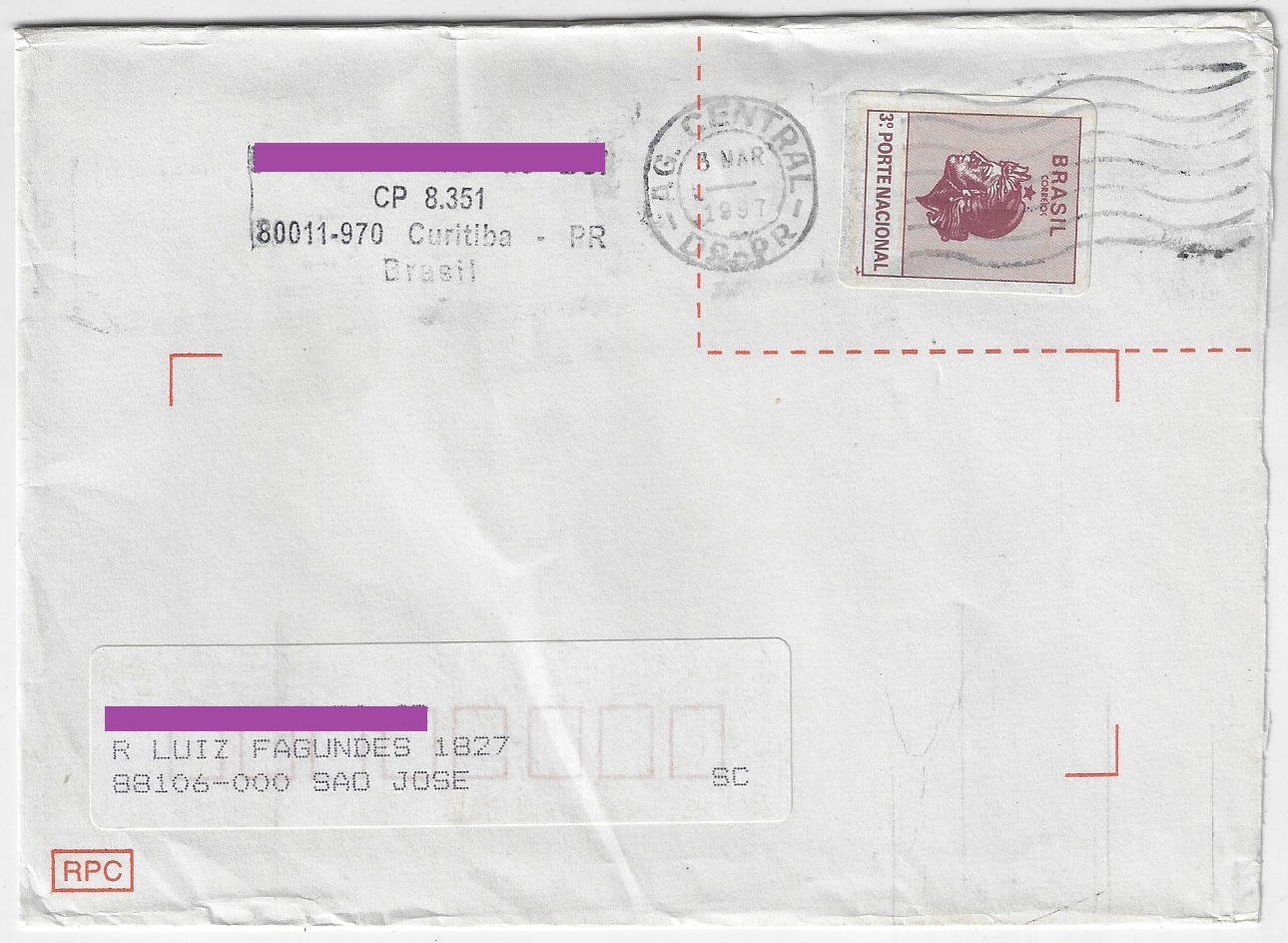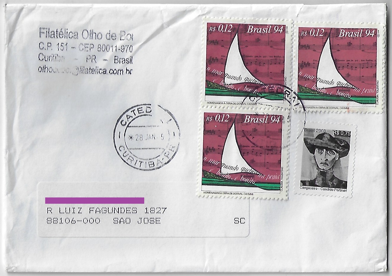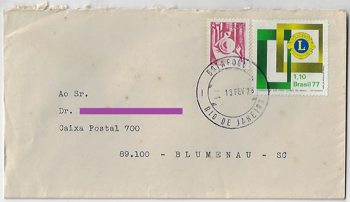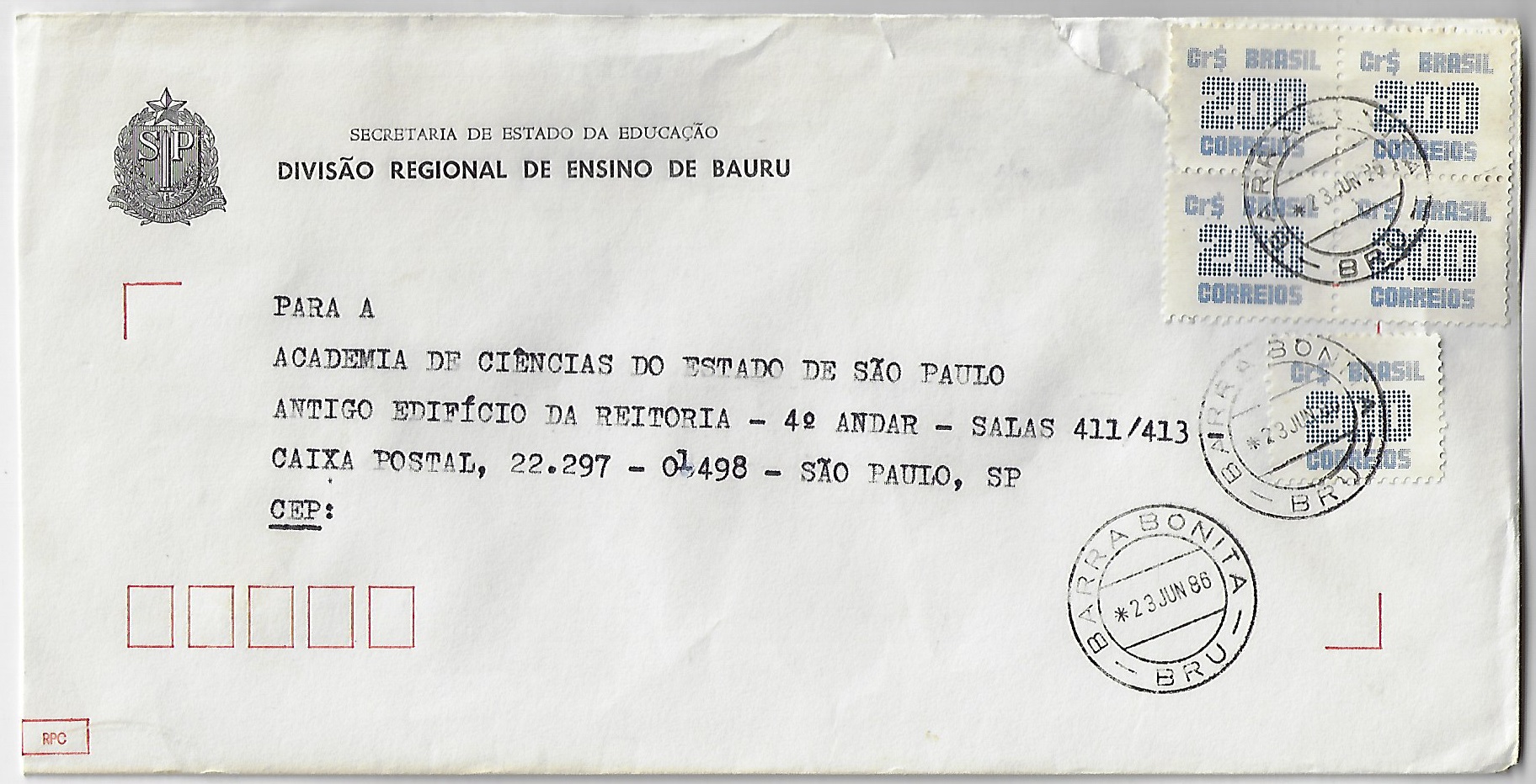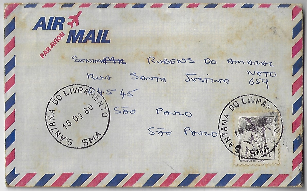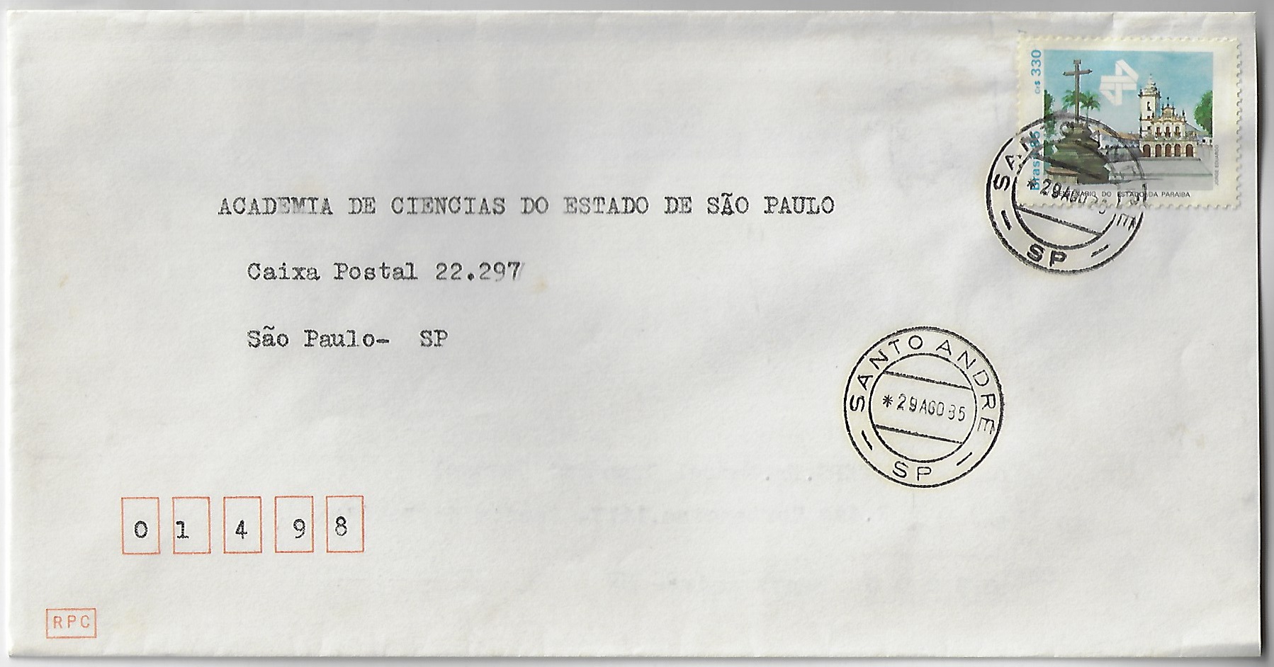 | 80884 | 2023, envelope prioritário registrado enviado de Biguaçu (21/11) para San Francisco / EUA, retornado ao remetente, marcas de triagem eletrônica na frente e no verso, 5 selos comemorativos 1ª Conferência Nacional da Juventure e 2 regulares Engraxate | 10,00 | Foto |
