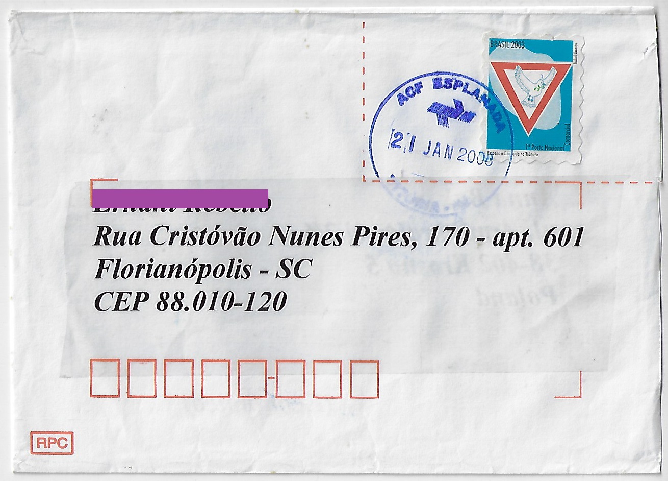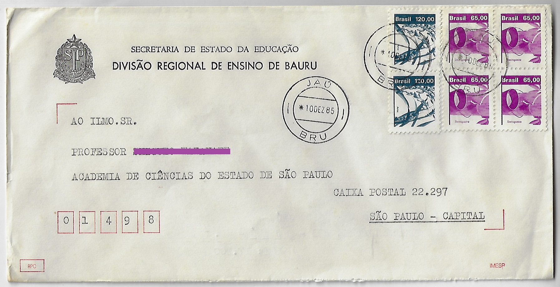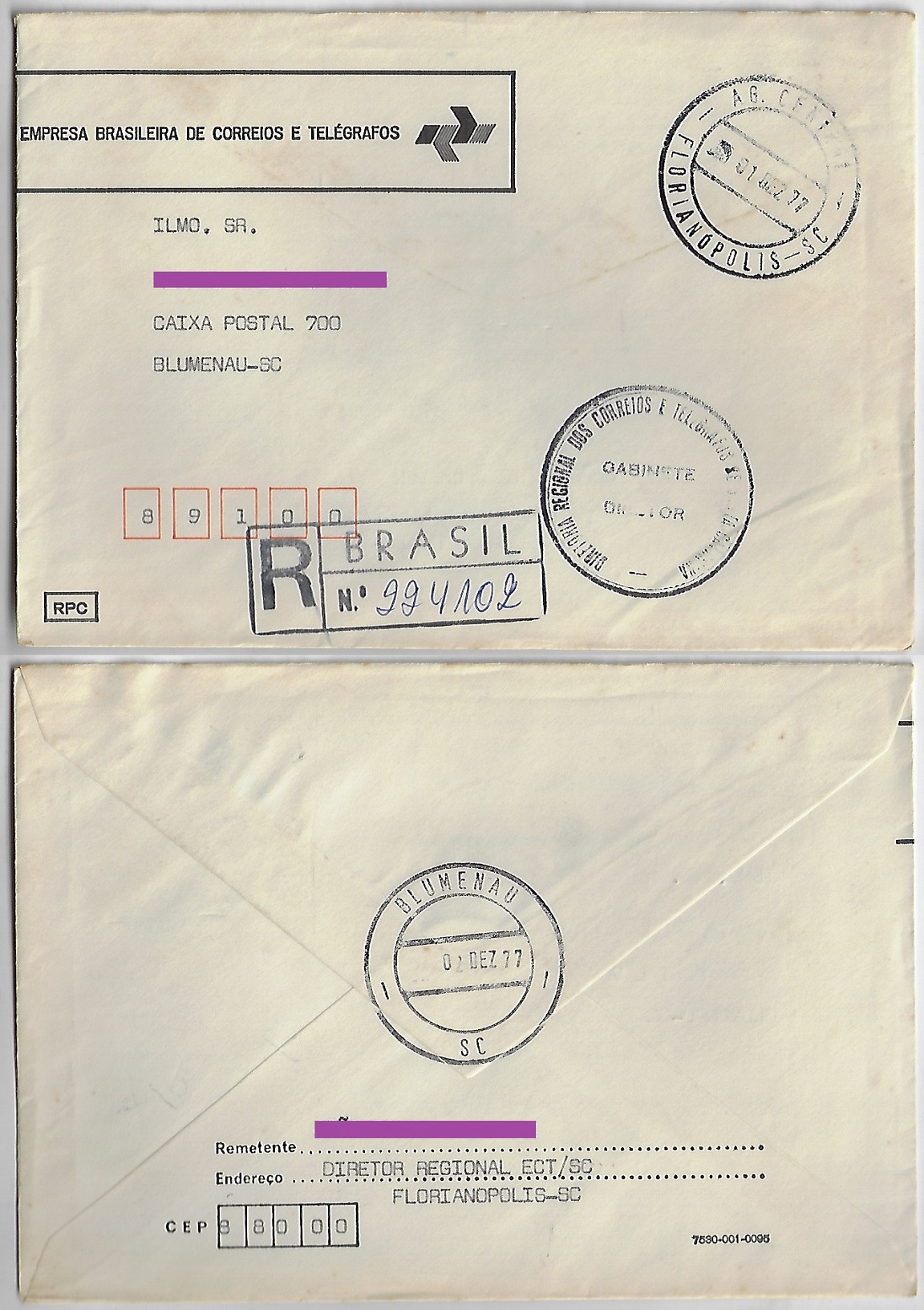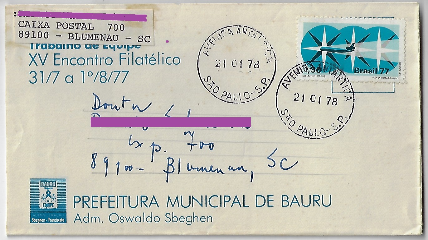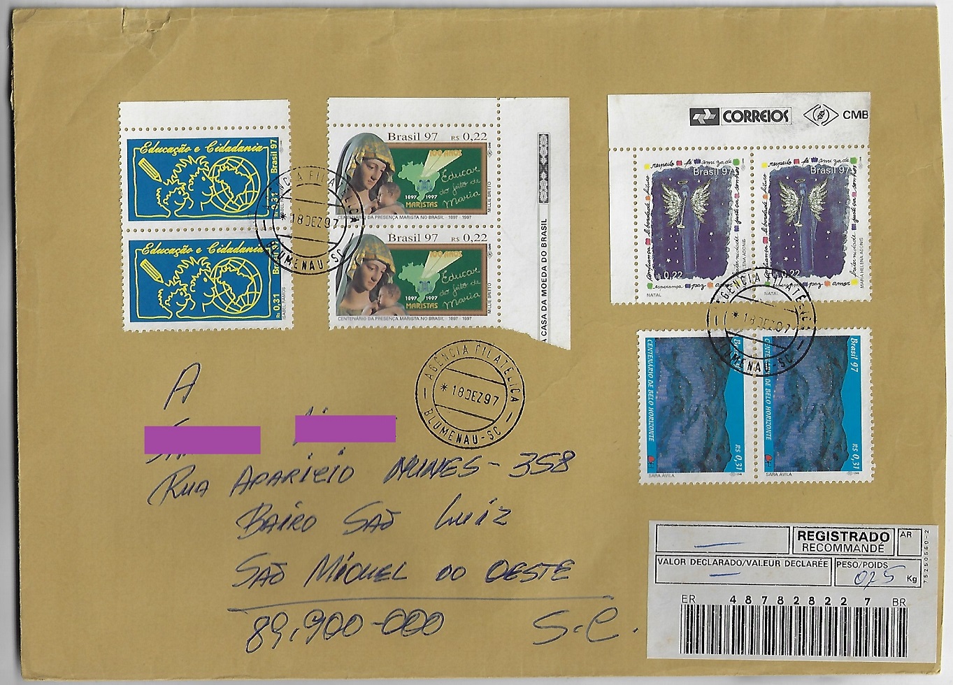 | 80884 | 2023, envelope prioritário registrado enviado de Biguaçu (21/11) para San Francisco / EUA, retornado ao remetente, marcas de triagem eletrônica na frente e no verso, 5 selos comemorativos 1ª Conferência Nacional da Juventure e 2 regulares Engraxate | 10,00 | Foto |