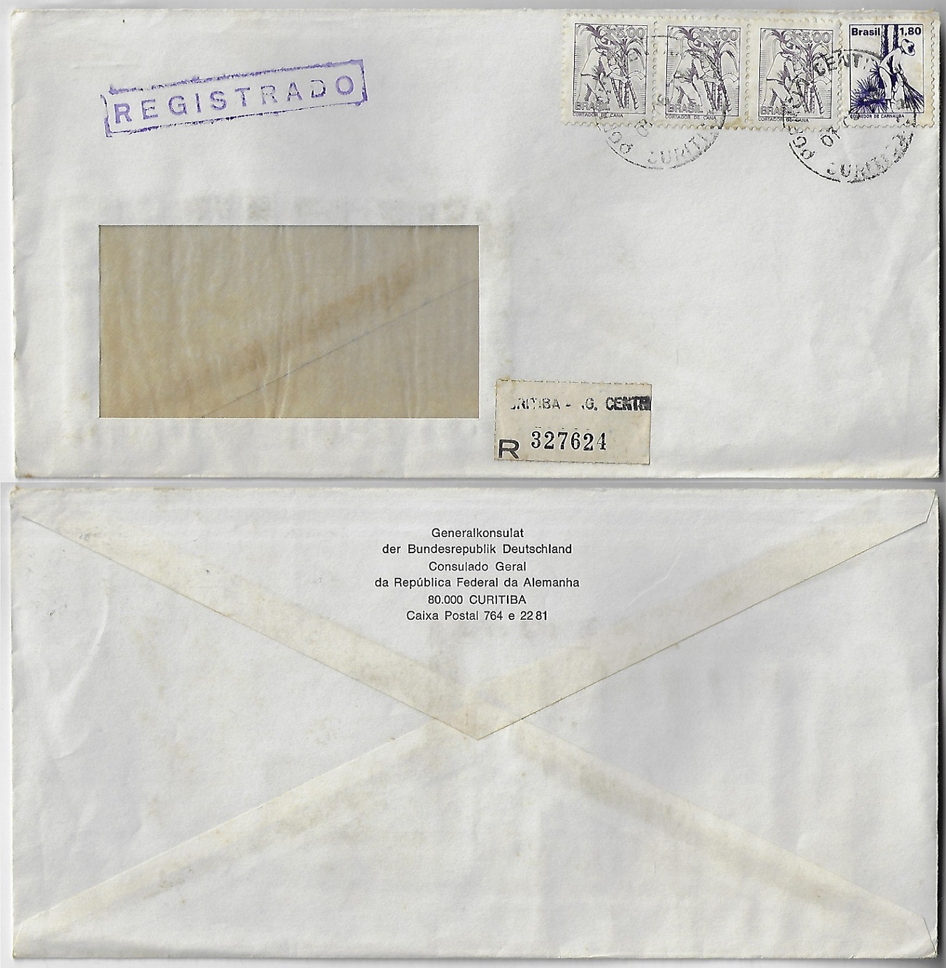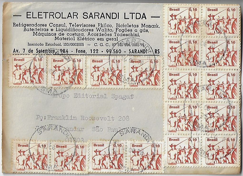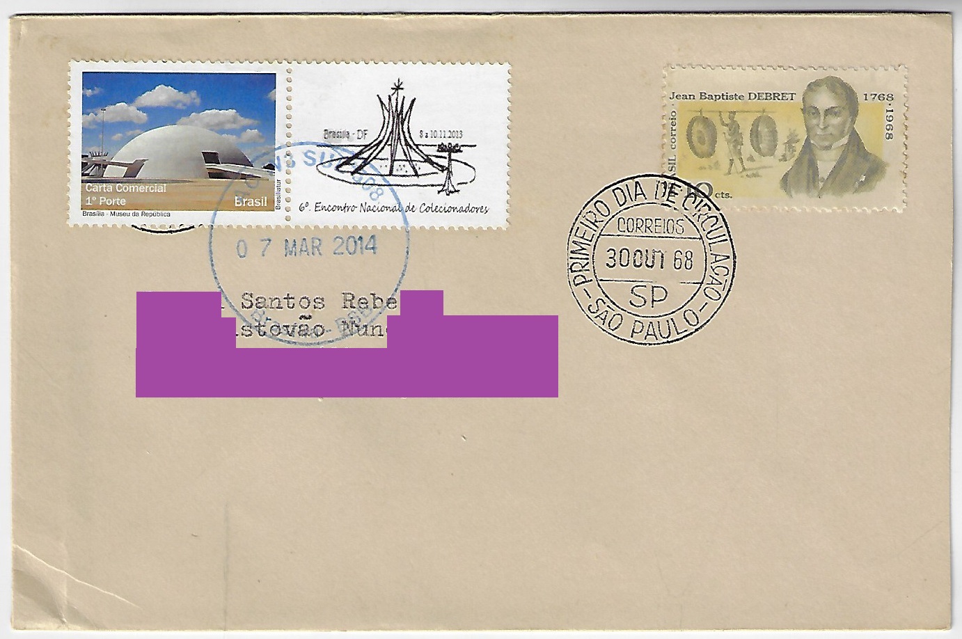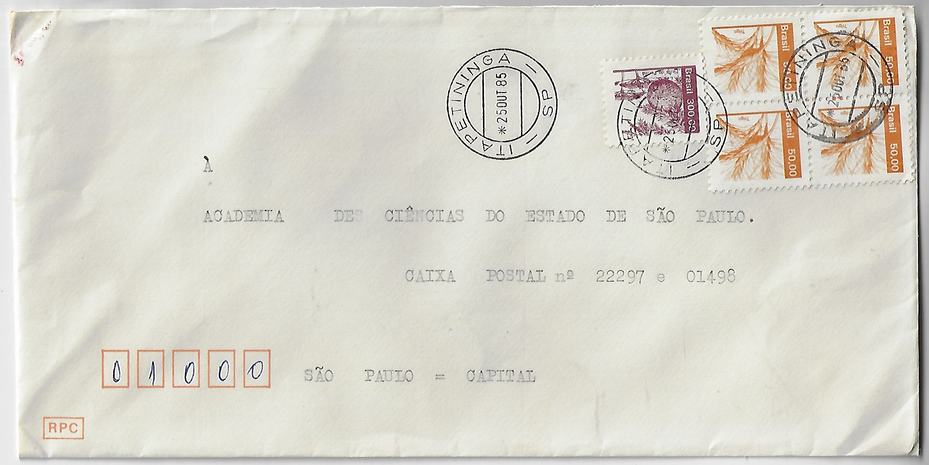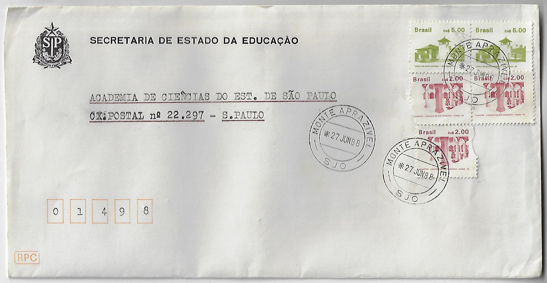 | 80884 | 2023, envelope prioritário registrado enviado de Biguaçu (21/11) para San Francisco / EUA, retornado ao remetente, marcas de triagem eletrônica na frente e no verso, 5 selos comemorativos 1ª Conferência Nacional da Juventure e 2 regulares Engraxate | 10,00 | Foto |